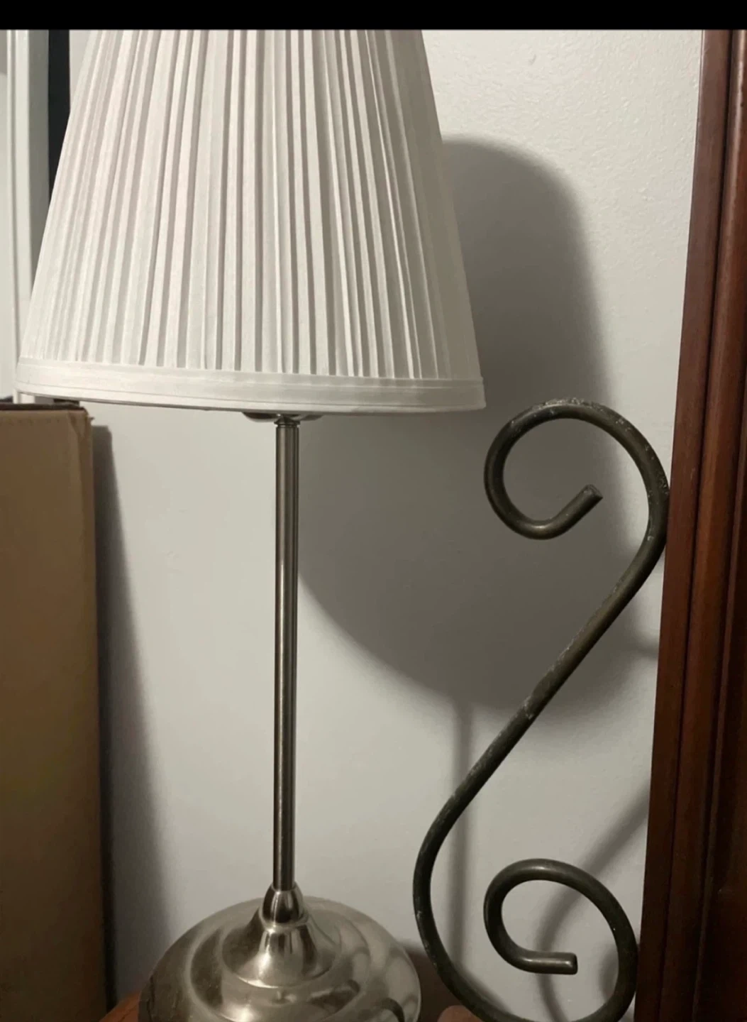 A classic table lamp featuring a pleated white fabric shade and a brushed metal base. It's approximately 20 inches tall. Perfect for adding a warm glow to any room!