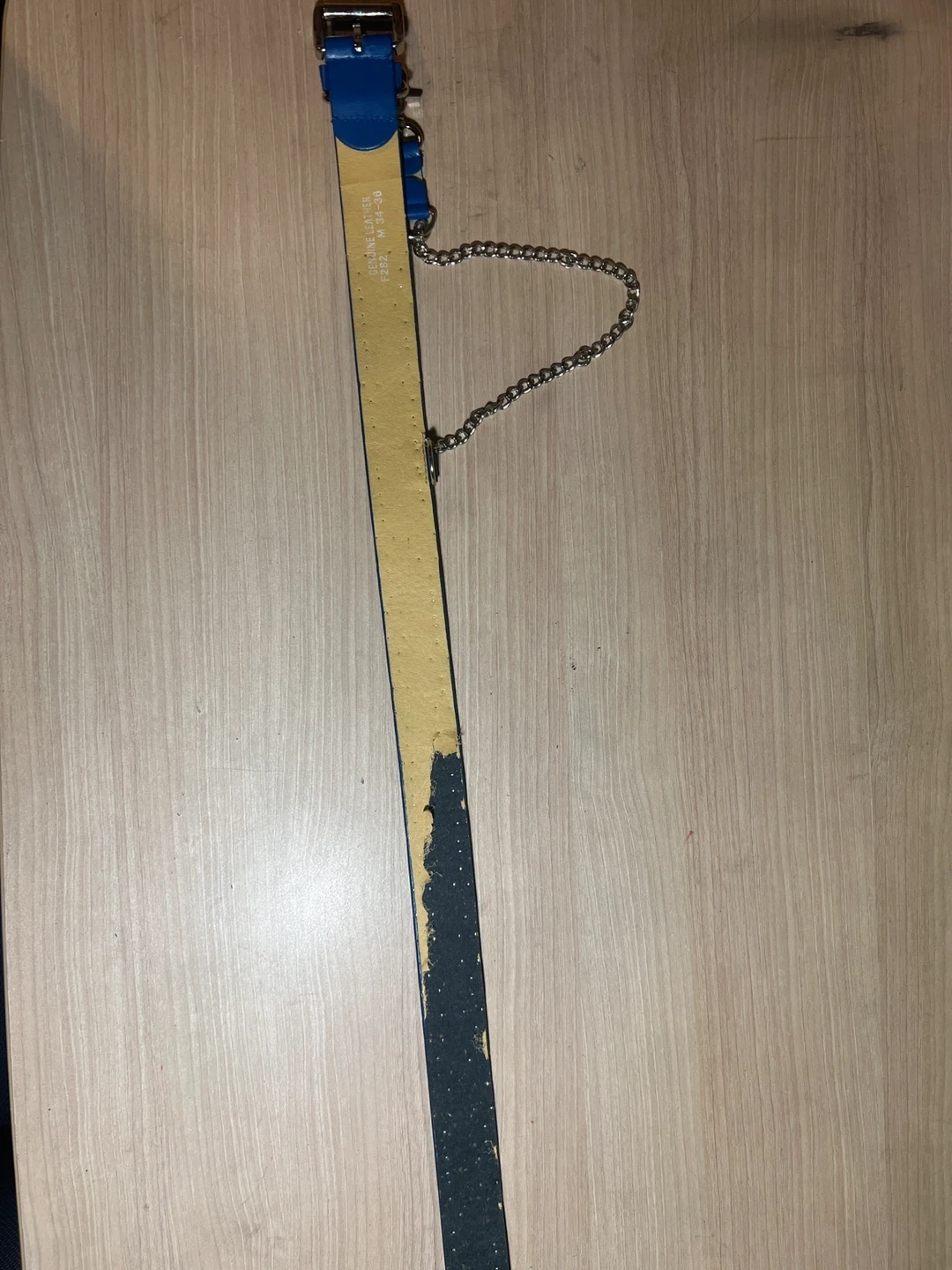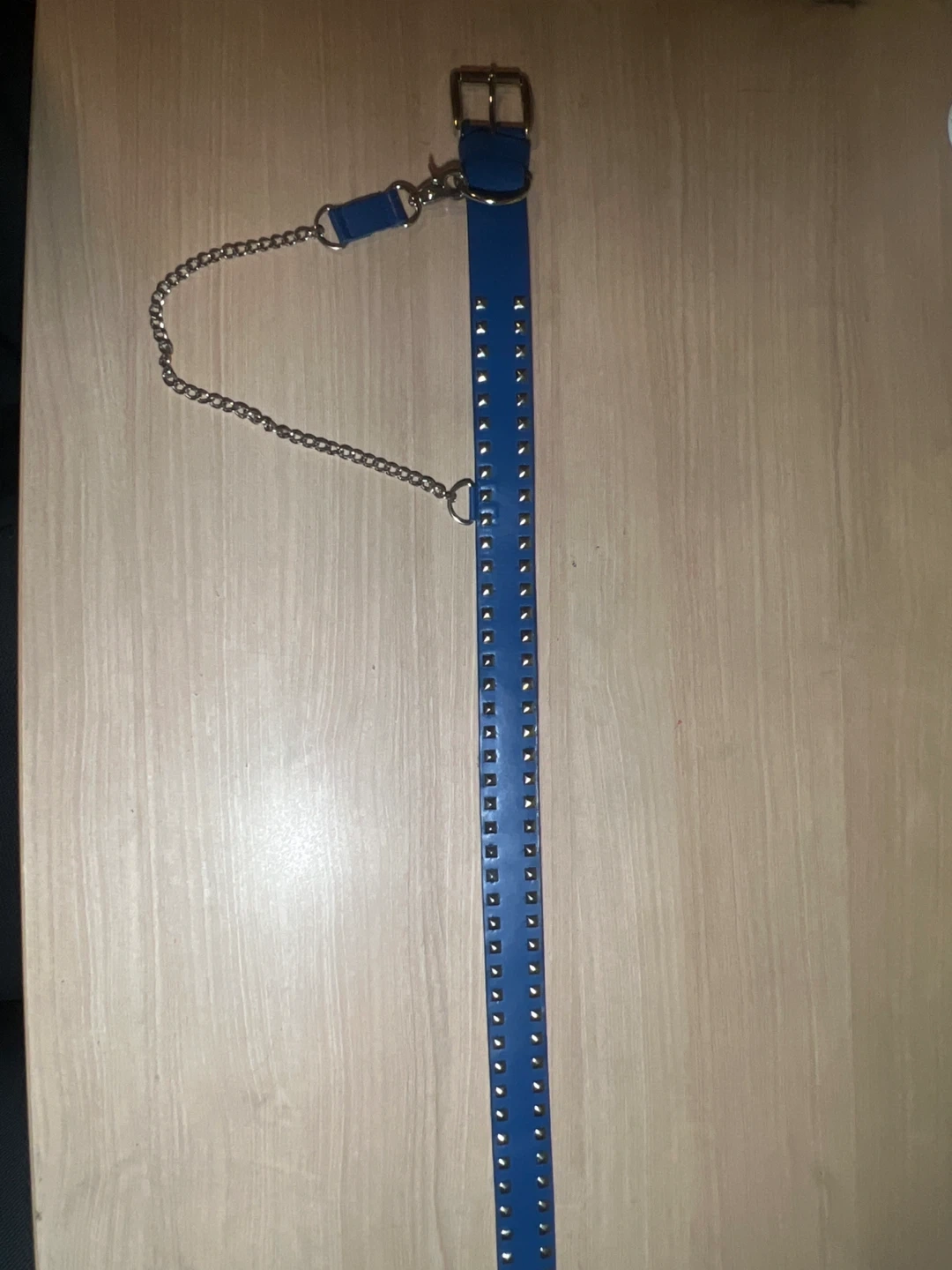 This blue belt features a full row of metal studs along its length. It also comes with a detachable metal chain for added style. The buckle is a classic gold-toned metal.