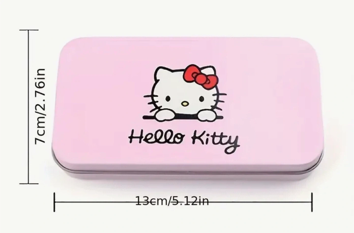 This is a Hello Kitty makeup brush set that comes with a handy tin case for storage. It includes six pink brushes with silver ferrules. The tin case measures 13cm by 7cm.
