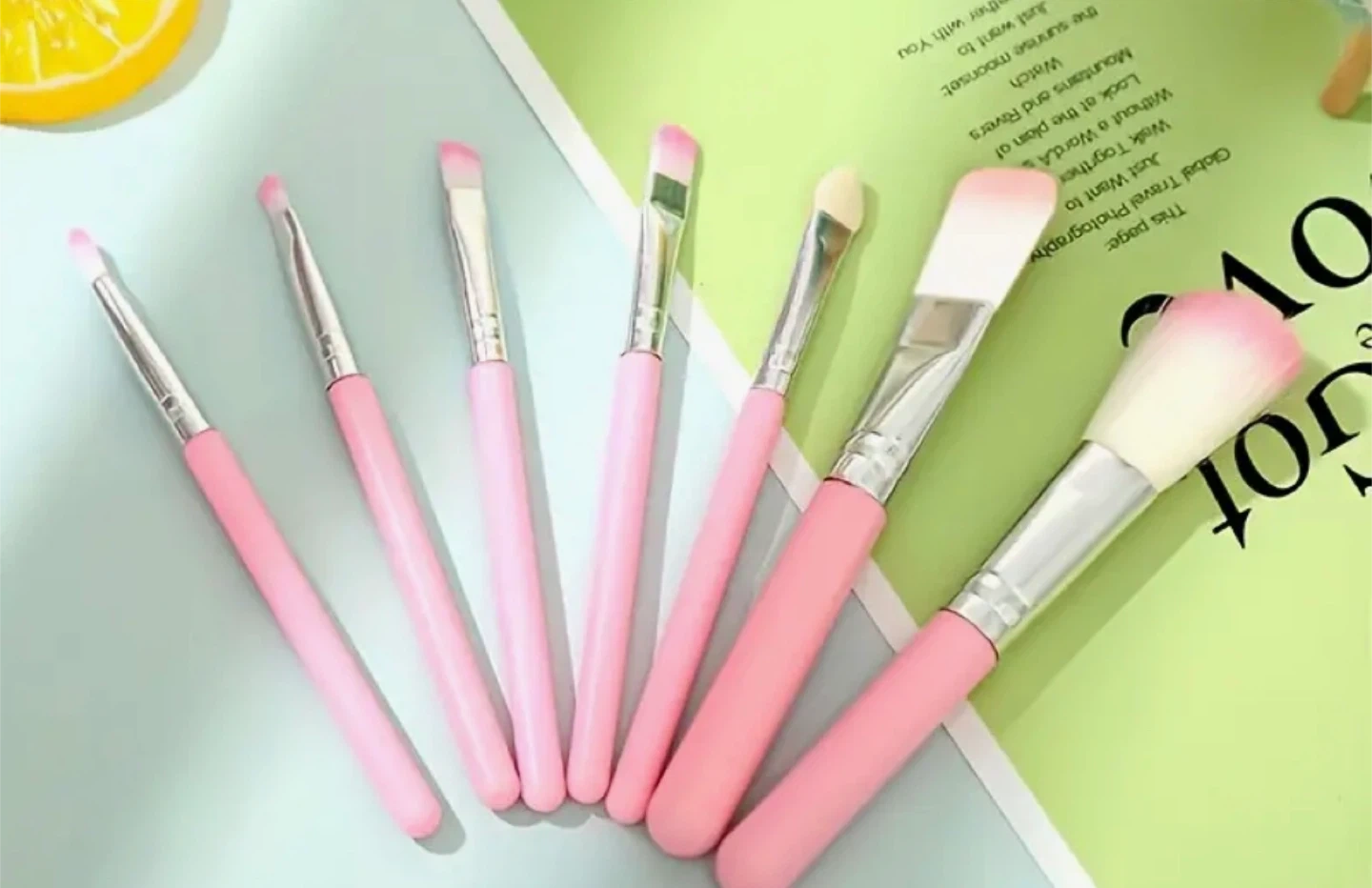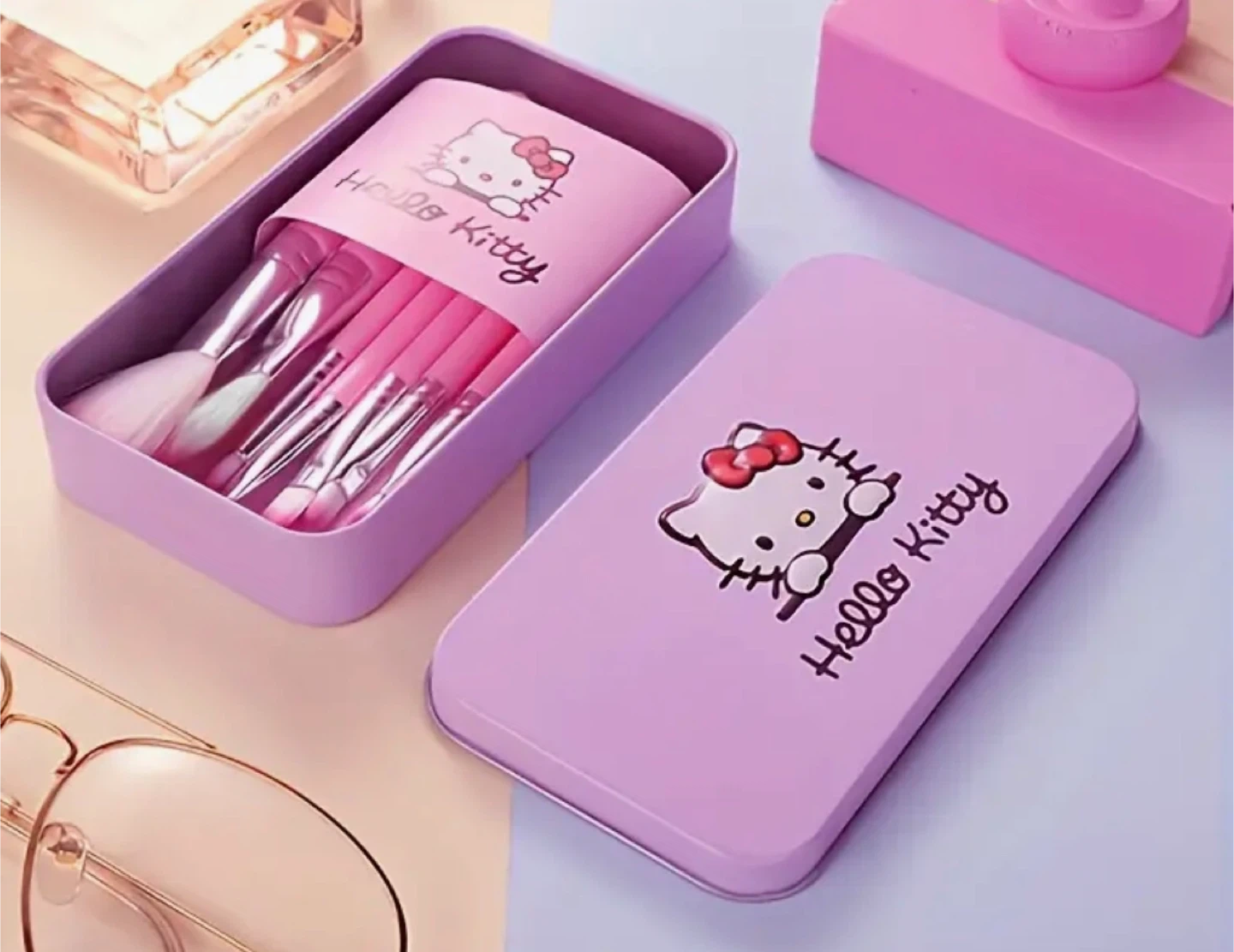 This is a Hello Kitty makeup brush set that comes with a handy tin case for storage. It includes six pink brushes with silver ferrules. The tin case measures 13cm by 7cm.