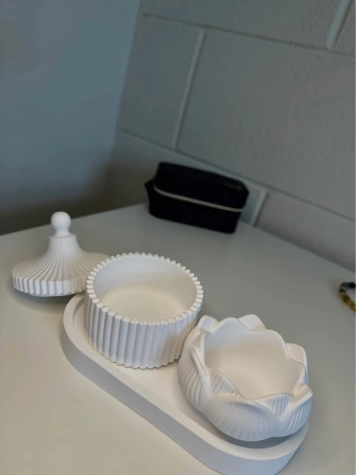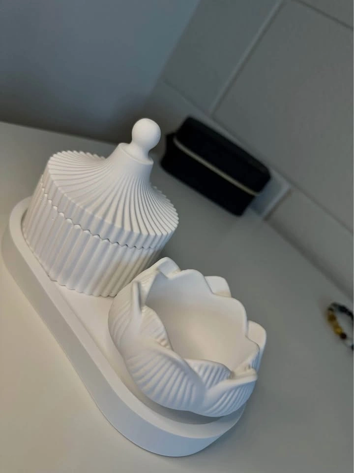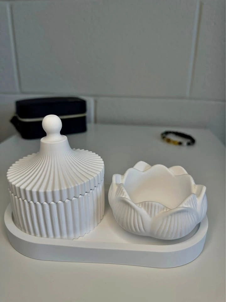 Bring a touch of elegance and sustainability into your home with this eco-resin storage set with tray ✨. The set includes a ribbed lidded jar and a lotus-shaped bowl, both placed on a matching minimalist tray. Made from eco-resin, this set is durable, lightweight, and eco-friendly — perfect for those who value style and sustainability. ✨ Details: • Includes: 1 ribbed jar with lid, 1 lotus bowl, 1 matching tray • Material: Eco-resin (eco-friendly, durable, smooth matte finish) • Color: Pure white (neutral, fits any interior) • Tray size: approx. 18 x 9 cm • Handmade with attention to detail 🎁 Perfect for: • Jewelry or keepsake storage • Candle holder / tealight holder • Bathroom vanity set (cotton pads, q-tips, etc.) • Decorative accent for living room or bedroom • Wedding, birthday, or housewarming gift Each set is hand-poured from eco-resin, making every piece unique with its own natural charm. A versatile and stylish addition to your home or a thoughtful gift for someone special.