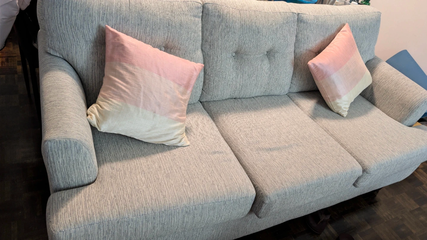 A comfy grey sofa is ready for your living room. It comes with two decorative throw pillows. Pillows comes with pillow covers in soft pink and cream stripe. The sofa has a modern design with tufted back cushions.