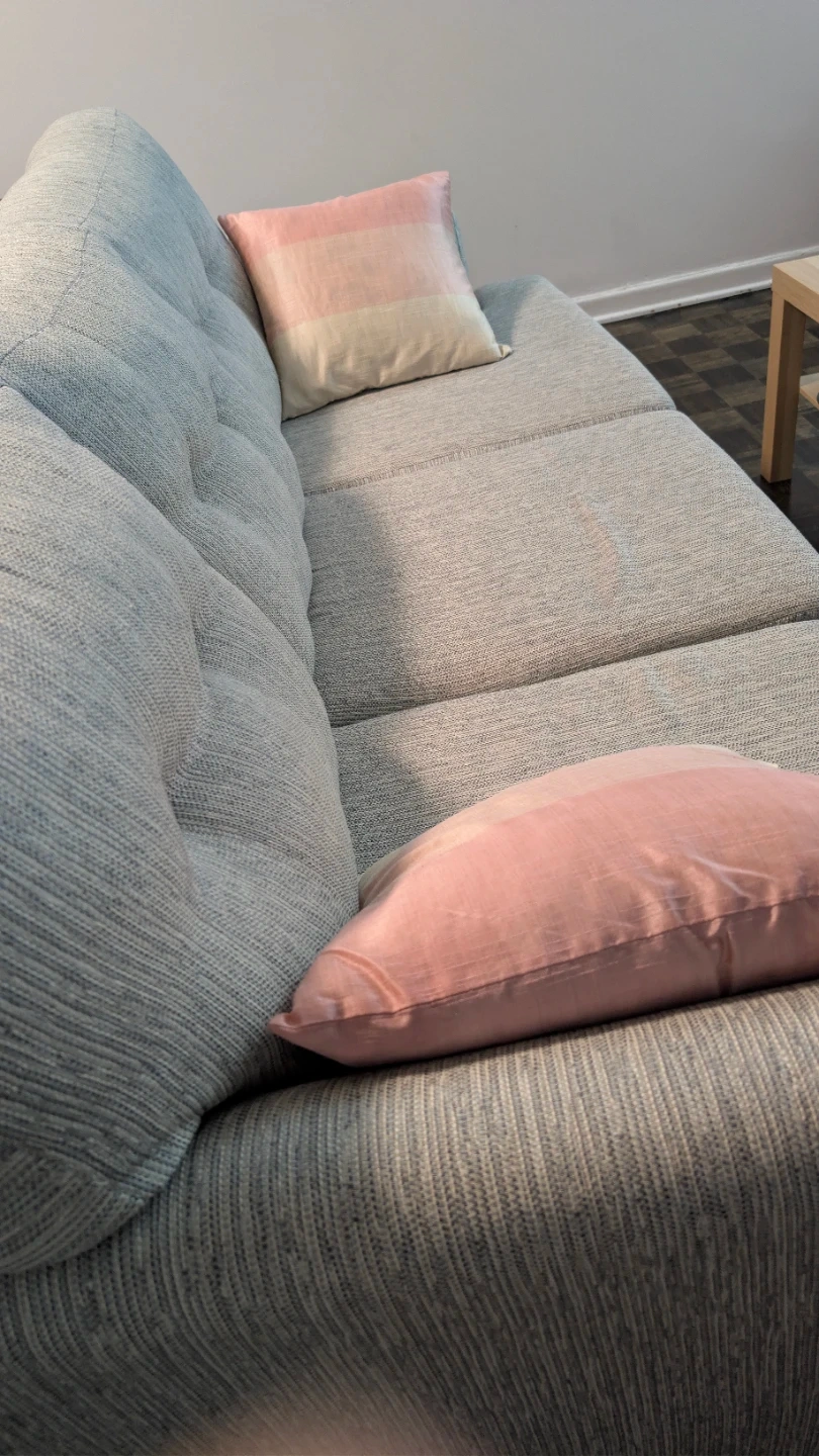 A comfy grey sofa is ready for your living room. It comes with two decorative throw pillows. Pillows comes with pillow covers in soft pink and cream stripe. The sofa has a modern design with tufted back cushions.