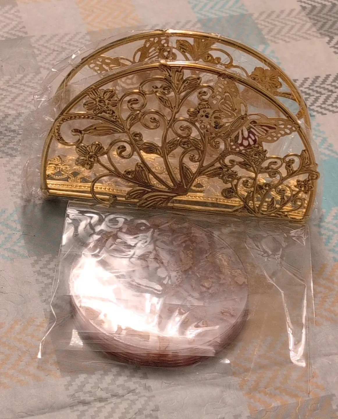 Elegant gold metal napkin holder with a decorative butterfly and floral design. It's perfect for adding a touch of charm to your dining table. Includes a roll of napkin rings.