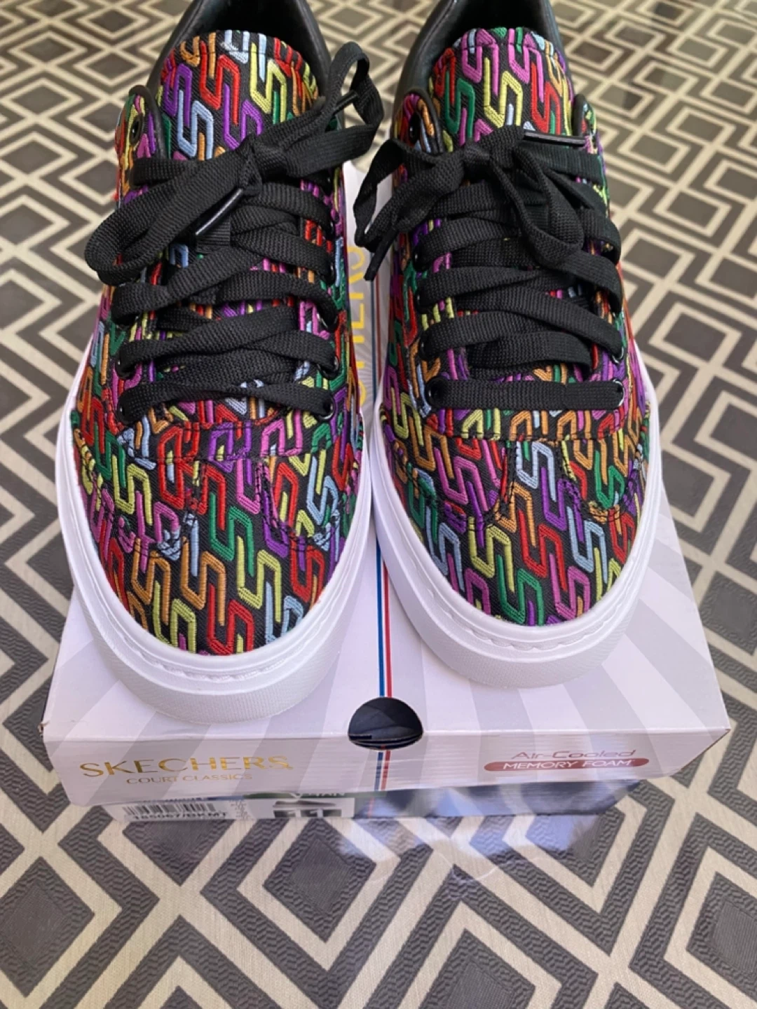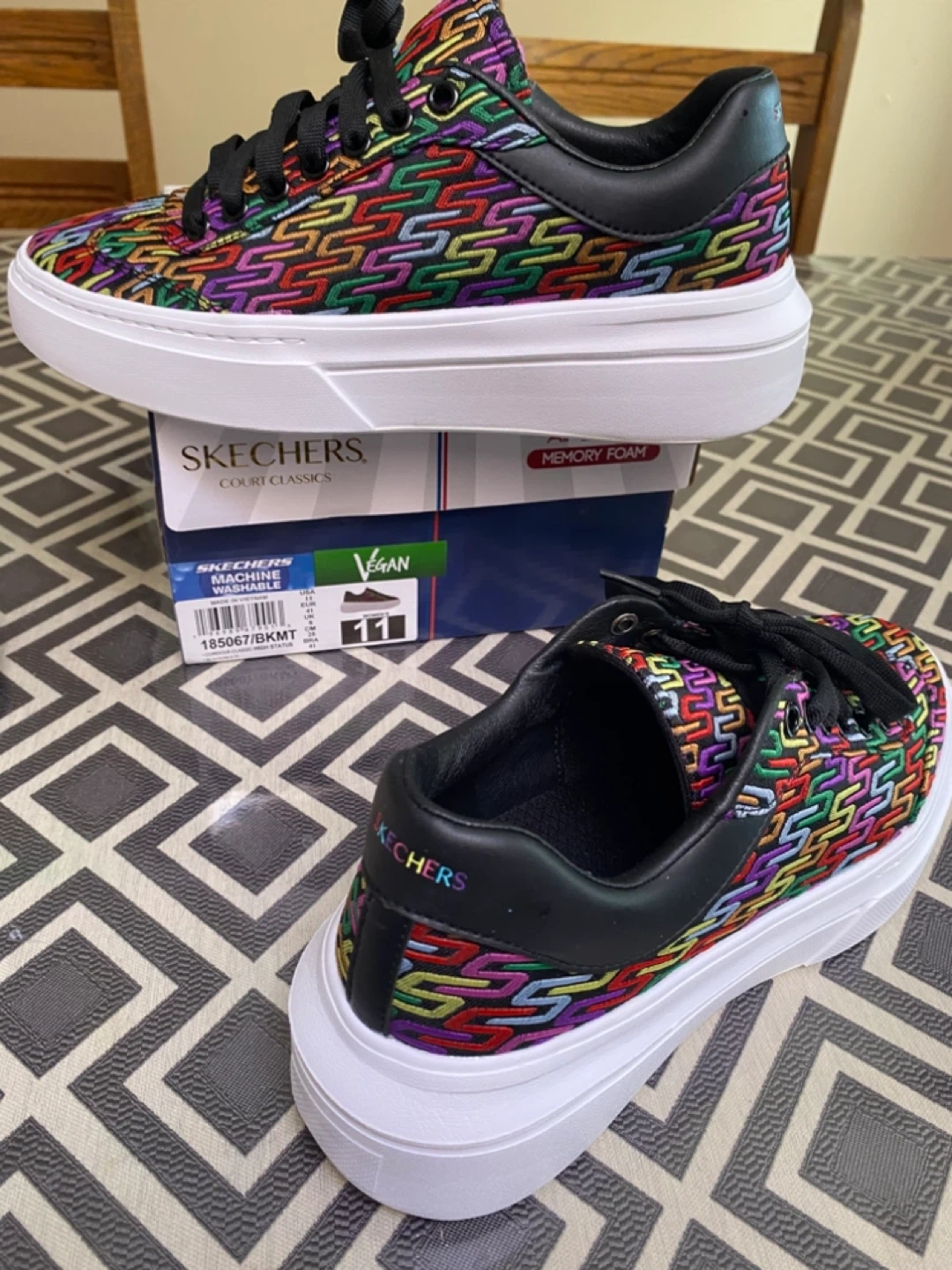 These are Skechers Court Classics sneakers in a size 11 US. They feature a colourful embroidered pattern and "Air-Cooled Memory Foam" for comfort. These shoes are also machine washable and vegan!