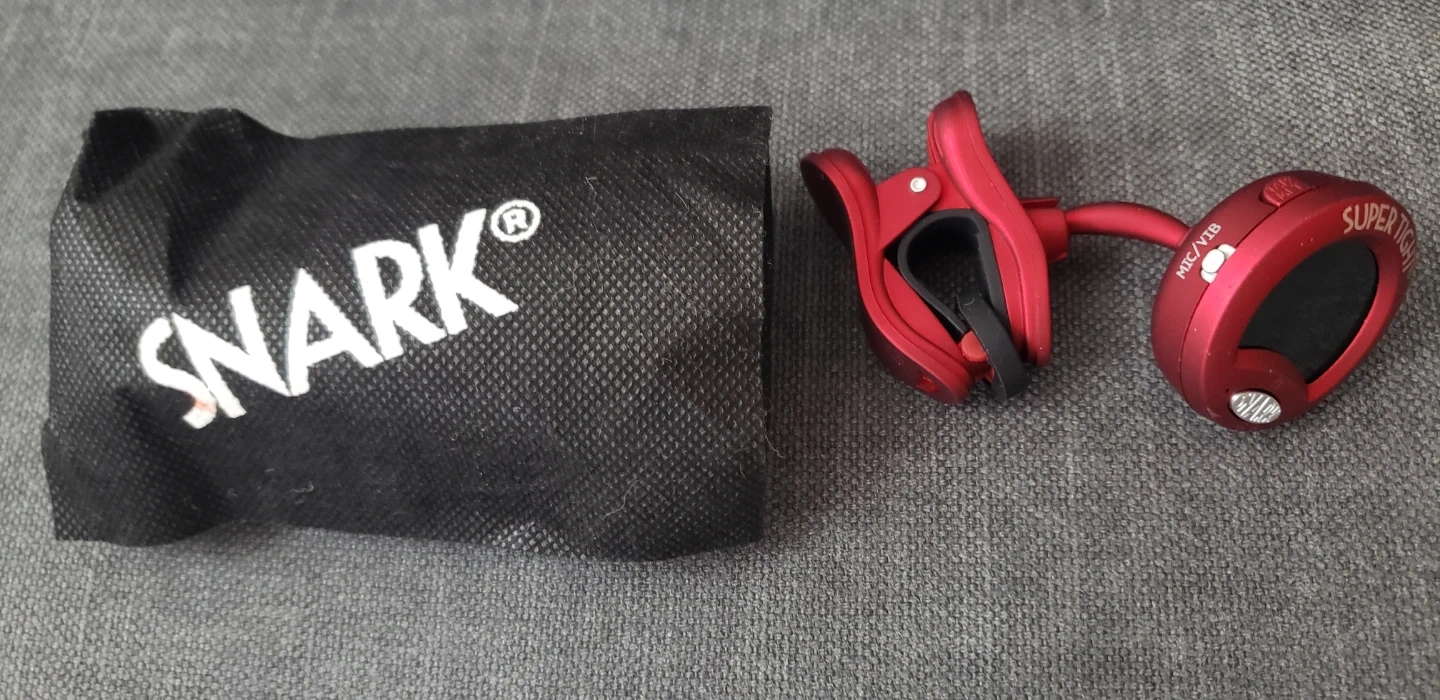 This is a red Snark Super Tight clip-on tuner for musical instruments. It has a digital display and a clip for attaching to headstocks. Includes a protective pouch.
