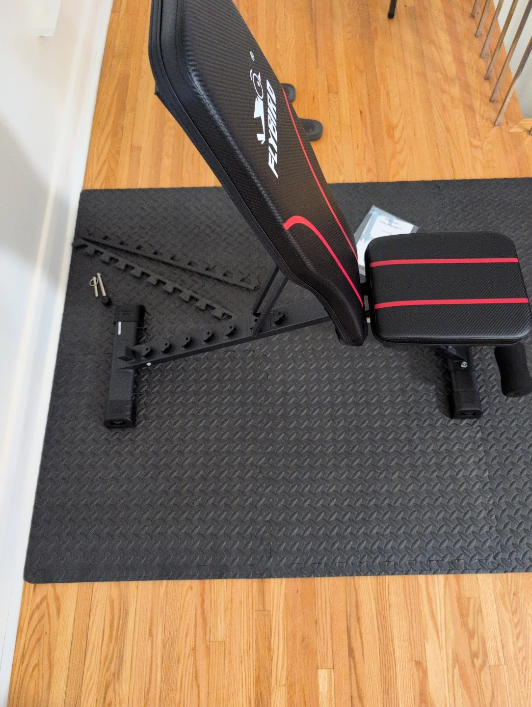 This FLYBIRD adjustable weight bench is in black with red accents. It's perfect for your home gym setup. Includes assembly wrench and user manual.
