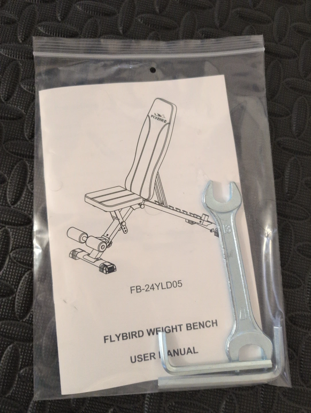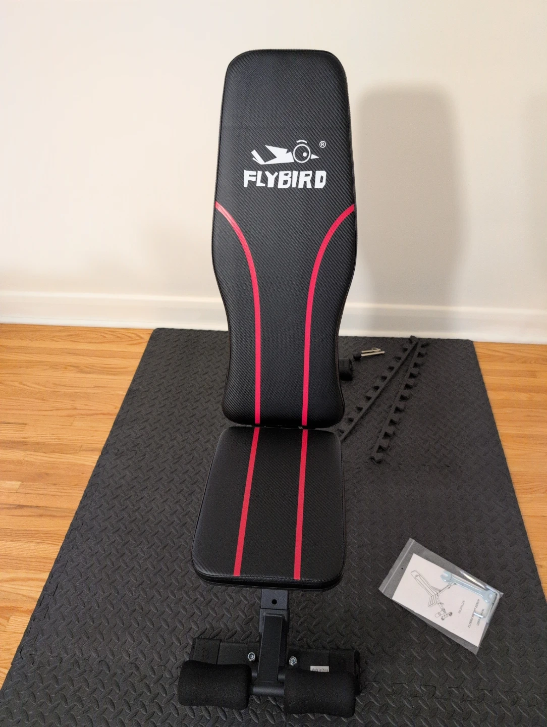 This FLYBIRD adjustable weight bench is in black with red accents. It's perfect for your home gym setup. Includes assembly wrench and user manual.