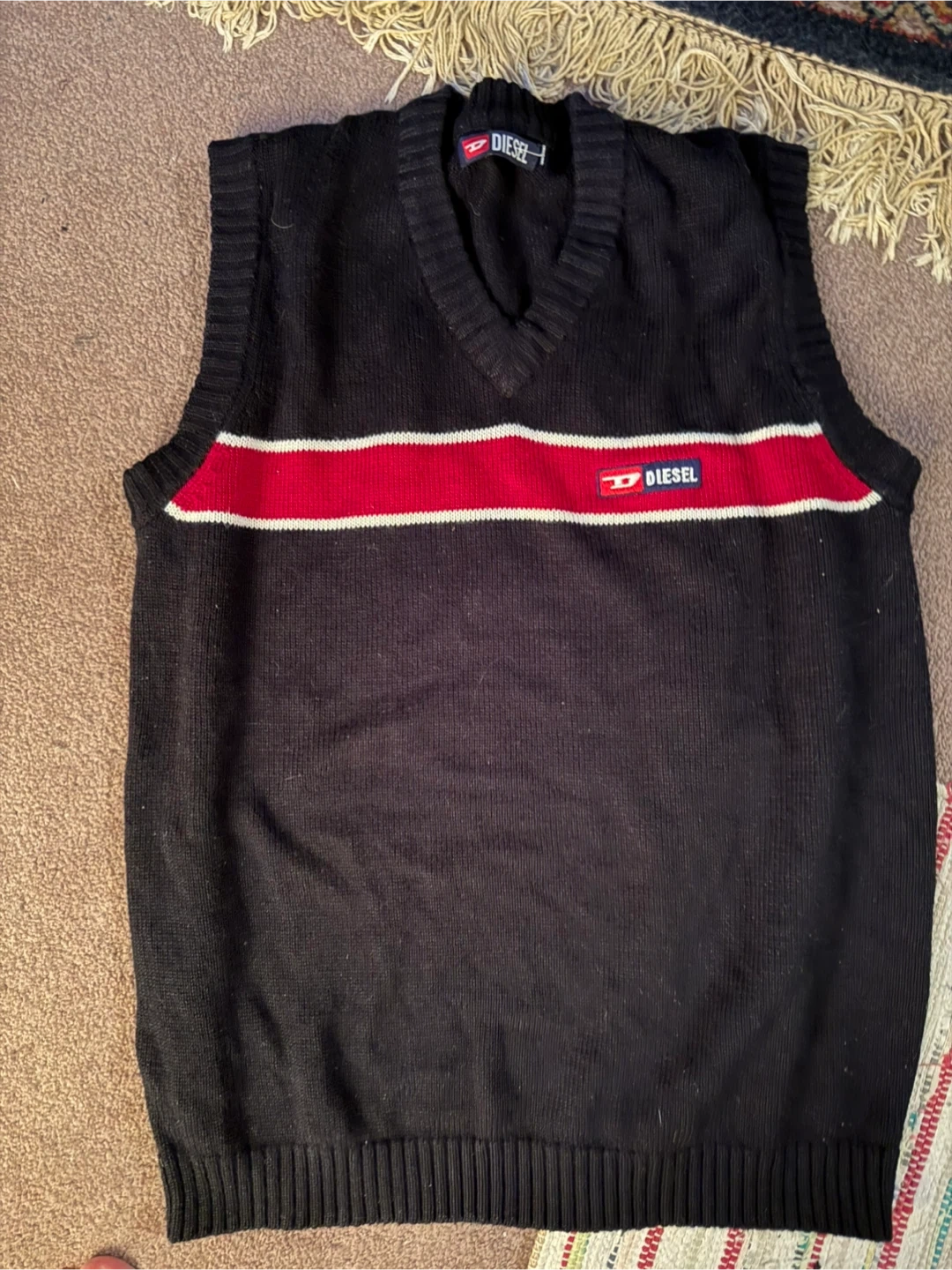 This Diesel sweater vest is black with a red and white stripe across the chest. It's made with 65% polyester and 35% cotton. This vest is great for layering! 63cm long and 50cm wide across chest and 45cm at bottom.