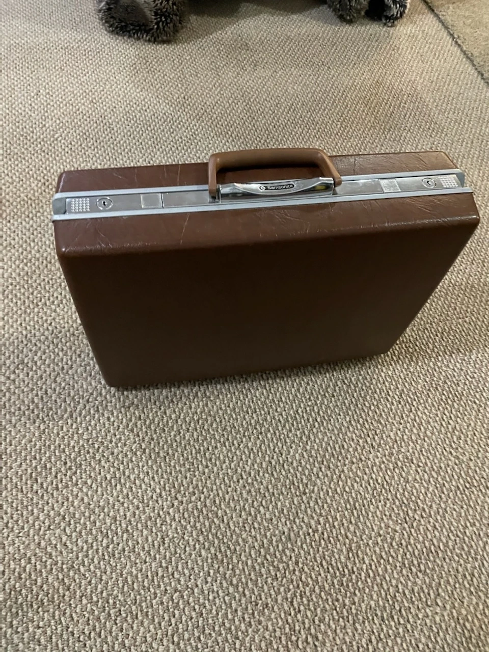 This is a vintage brown Samsonite locking briefcase WITH key. It has a classic design with a sturdy handle and silver-tone latches. A good option for carrying documents or essentials.