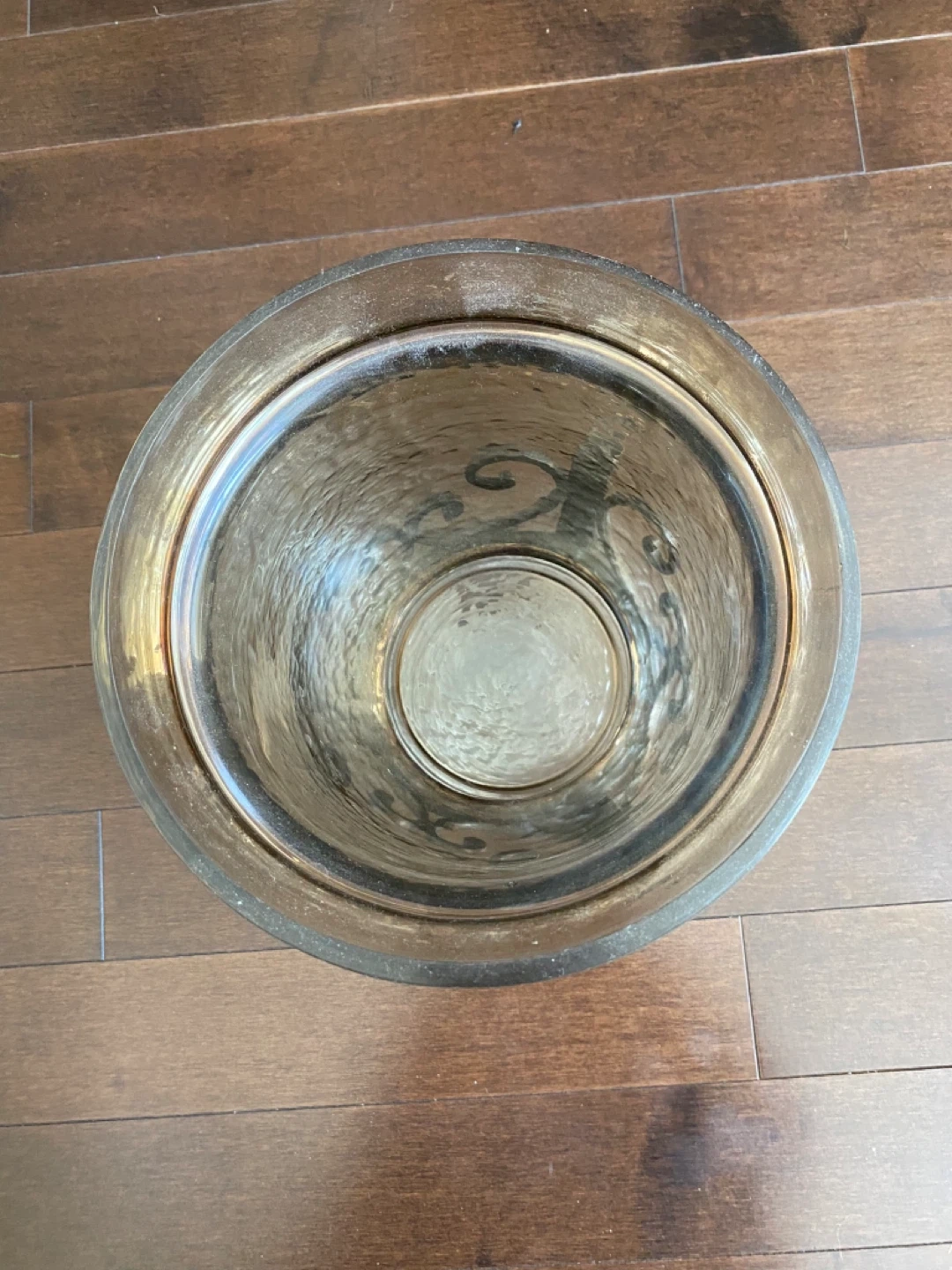 A beautiful glass hurricane candle holder with a decorative metal stand. It has a hammered glass texture and ornate metal scrollwork.