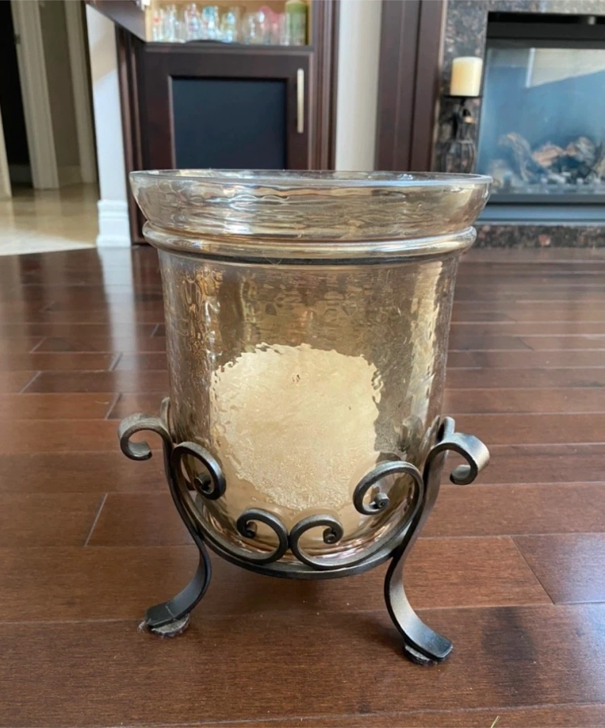 A beautiful glass hurricane candle holder with a decorative metal stand. It has a hammered glass texture and ornate metal scrollwork.