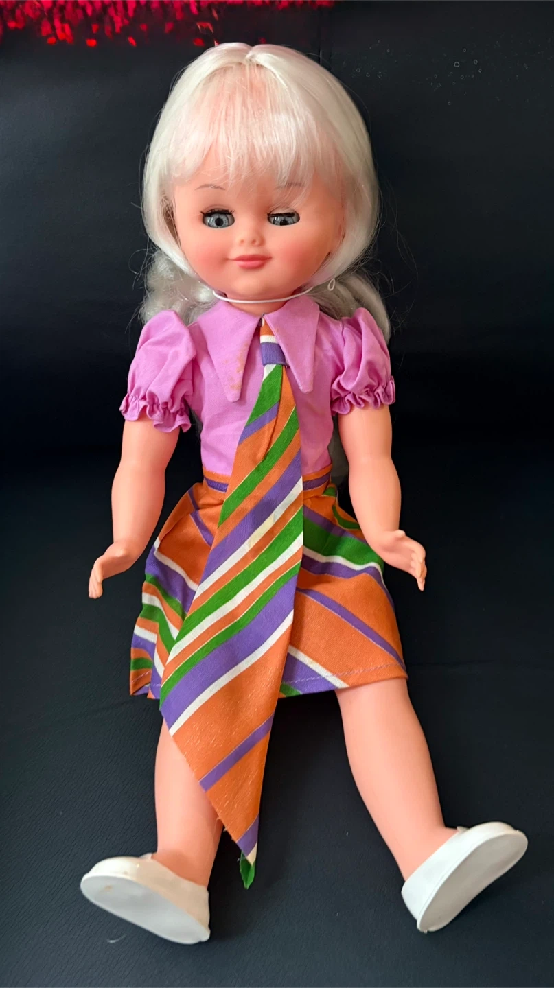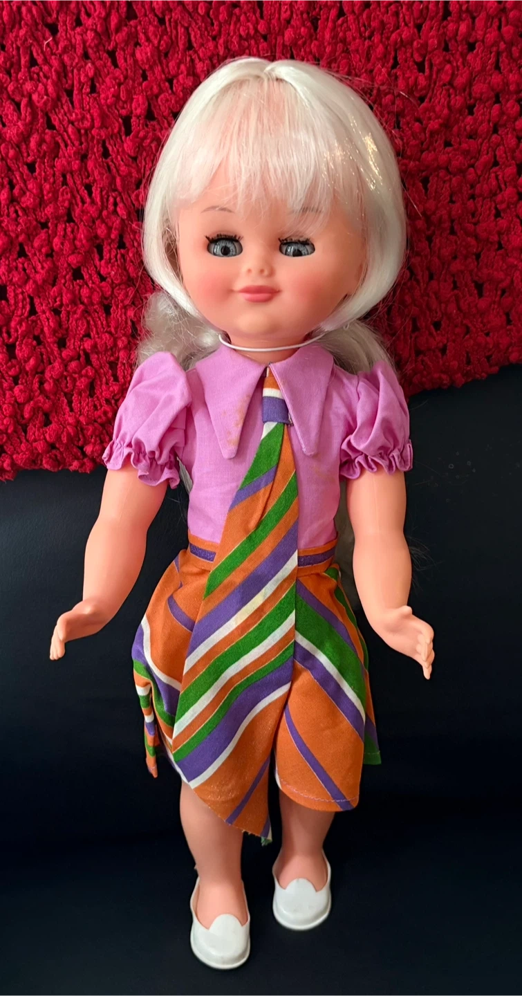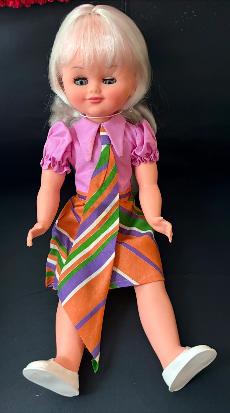 Here's a cute doll with blonde hair and blue eyes! She's wearing a pink shirt with a colourful striped skirt and white shoes. A great addition to any doll collection!