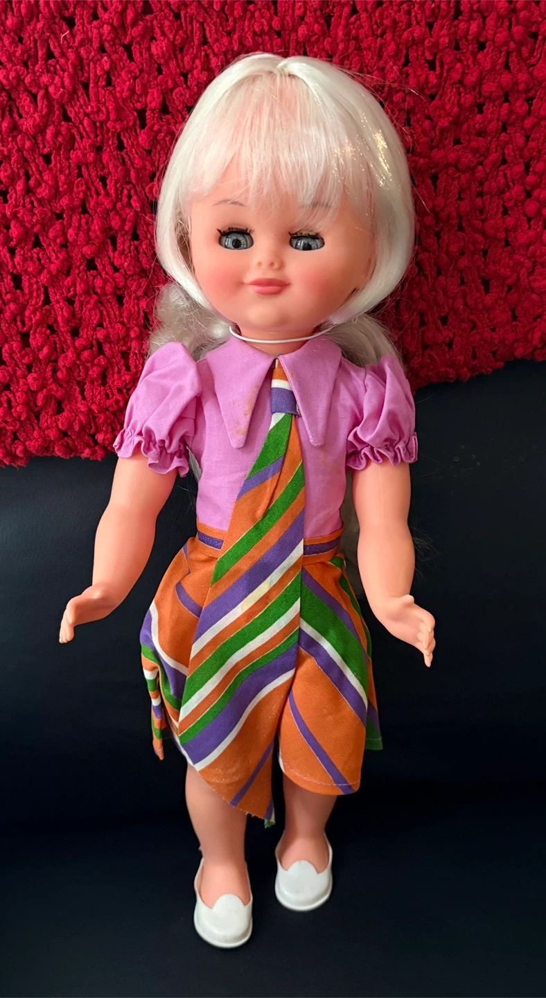 Here's a cute doll with blonde hair and blue eyes! She's wearing a pink shirt with a colourful striped skirt and white shoes. A great addition to any doll collection!