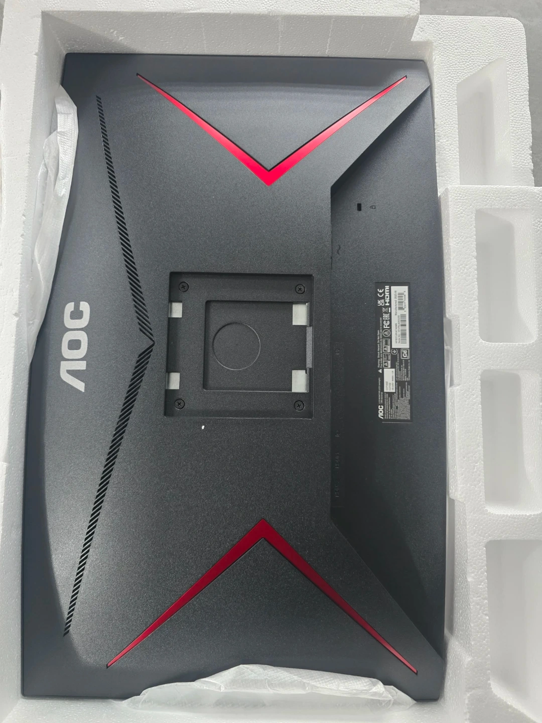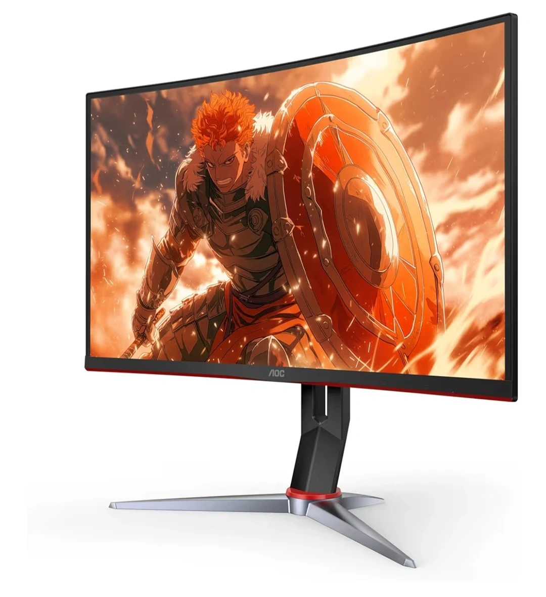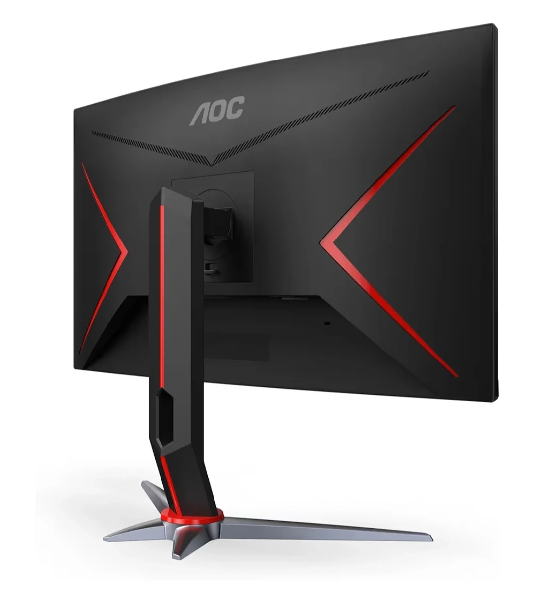 This AOC gaming monitor features a 27-inch curved display with a 1920x1080 FHD resolution and a 240Hz refresh rate. It's designed for an immersive gaming experience. The monitor has a sleek black finish with red accents.