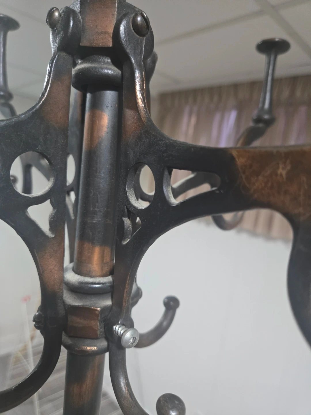 This vintage coat rack is made of metal with wooden accents. It features multiple hooks for hanging coats, hats, and scarves. It's a sturdy piece, perfect for an entryway or mudroom. It may be brass i am not sure itss antique . 70$ firm!!! Not negotiable. One coat hangar has a missing screw.