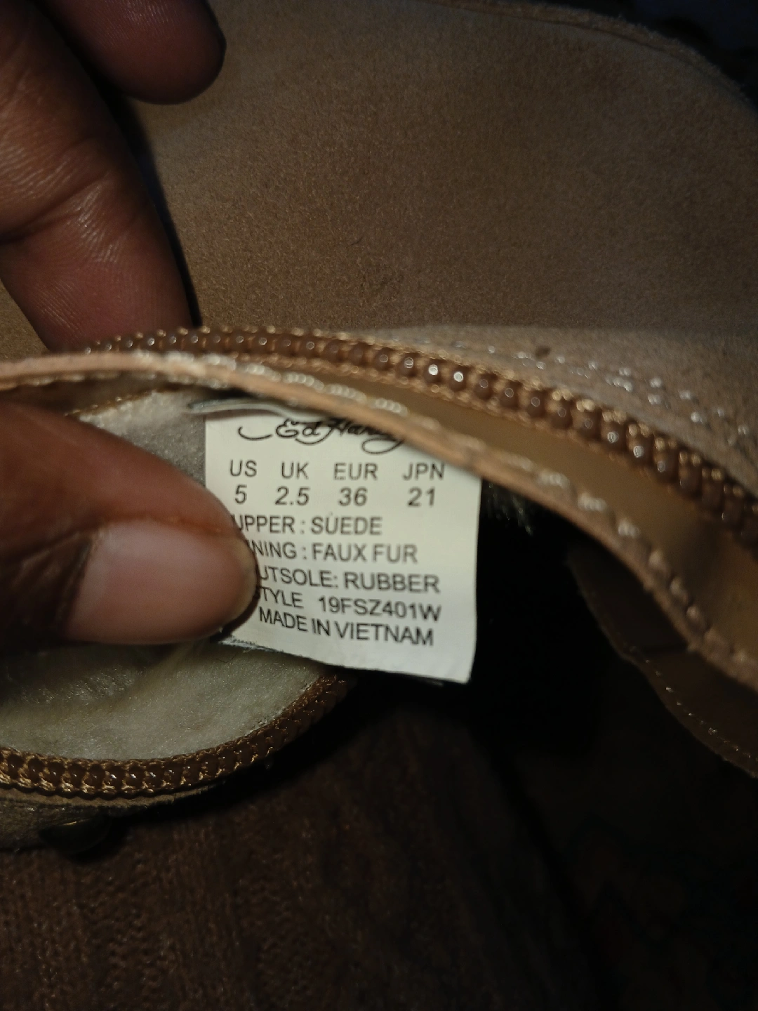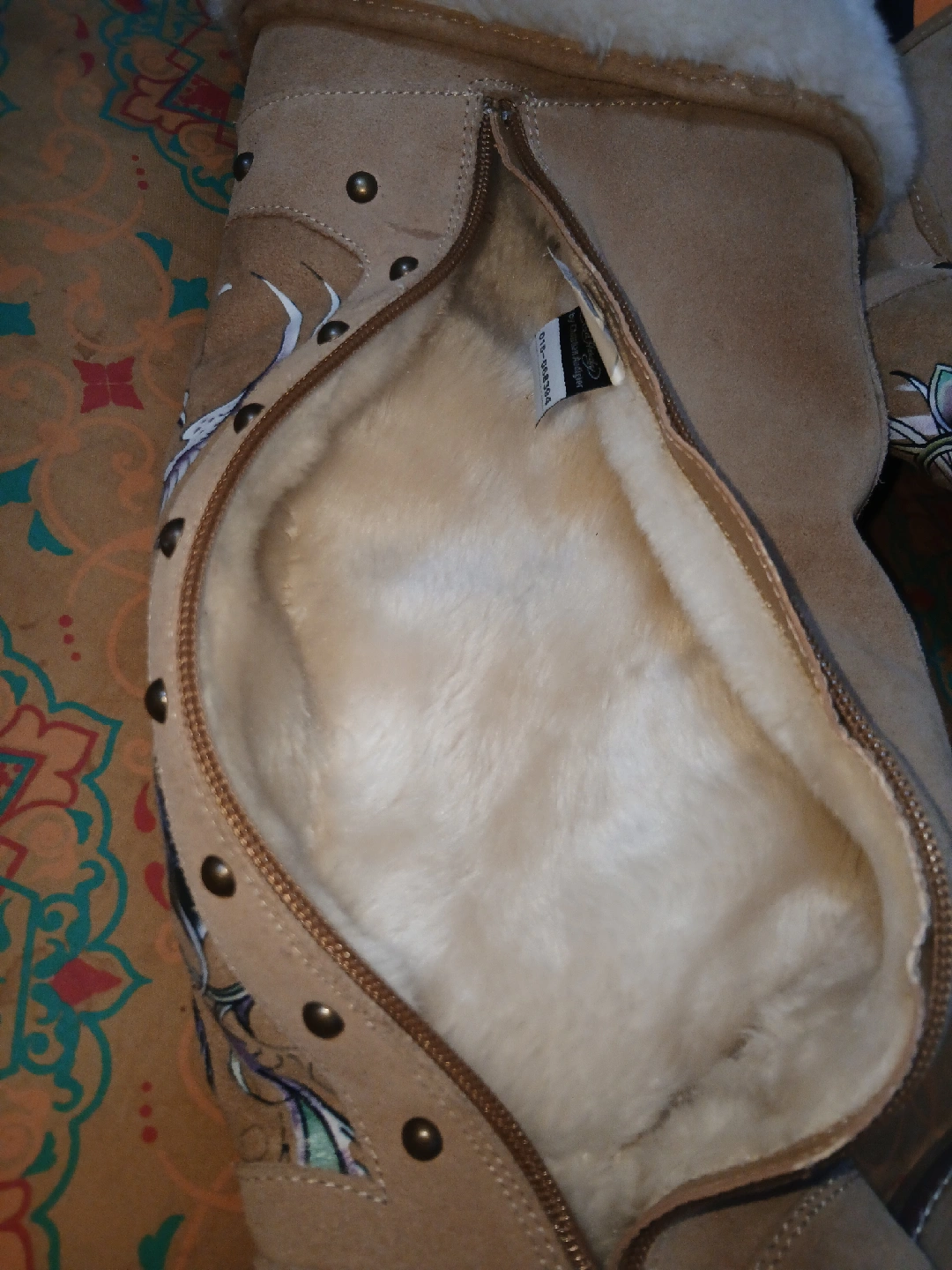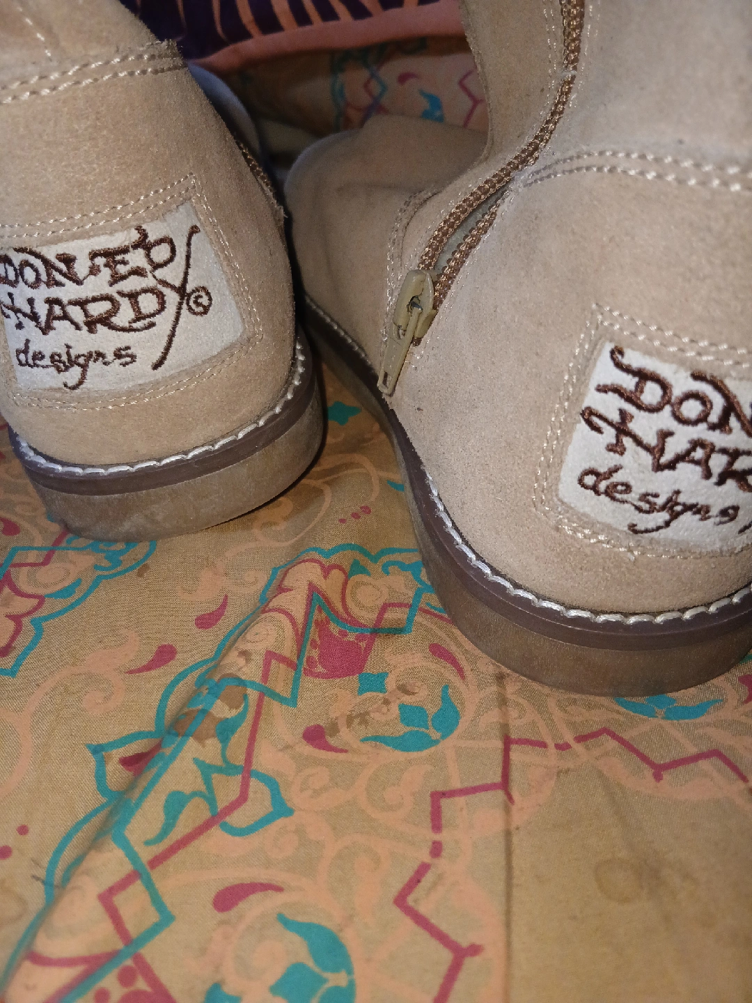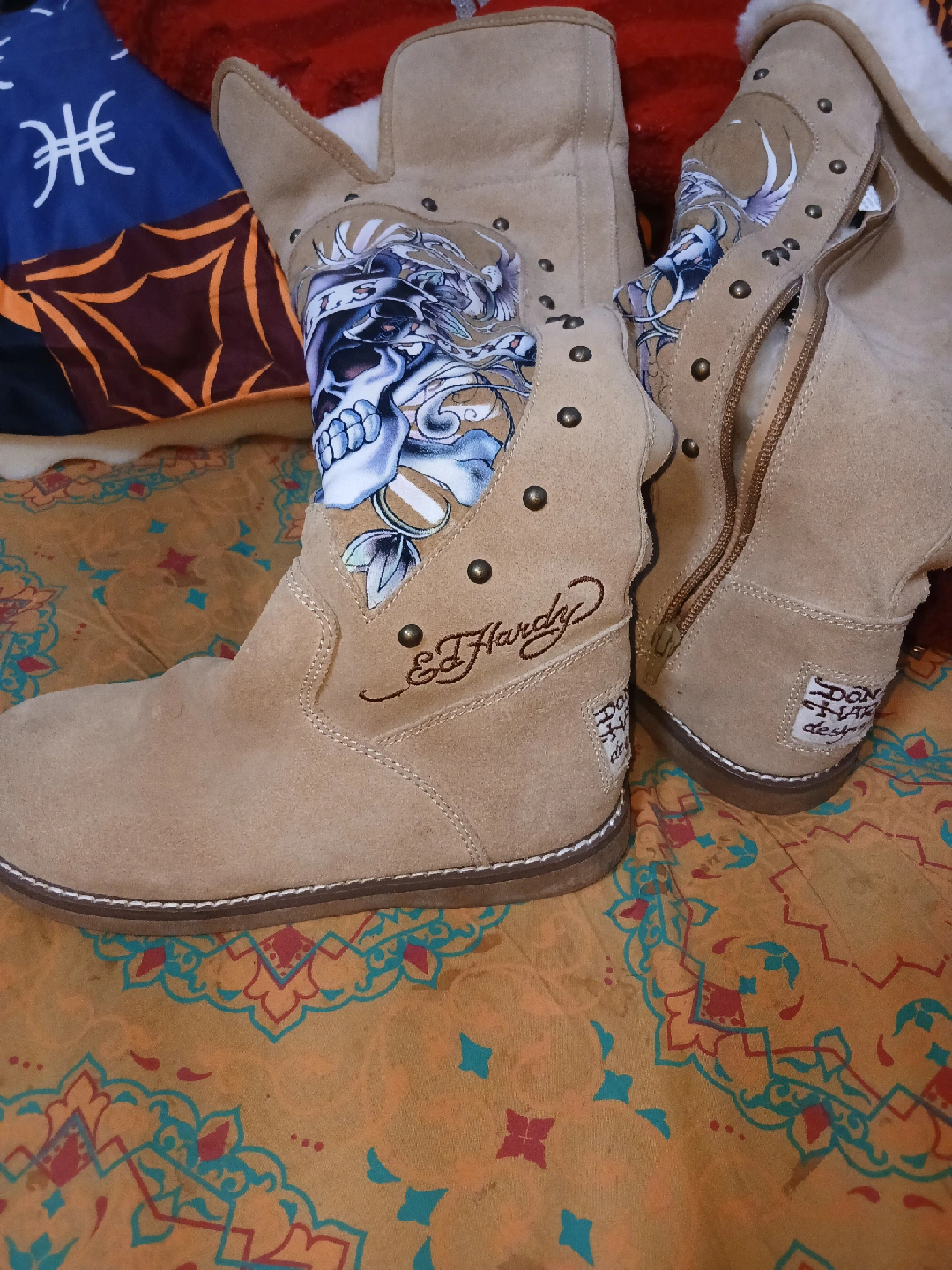 25Ed Hardy beige suede boots featuring a skull design. They have a zipper closure and are lined with a soft, furry material. These boots have some signs of wear but are still in good condition!
