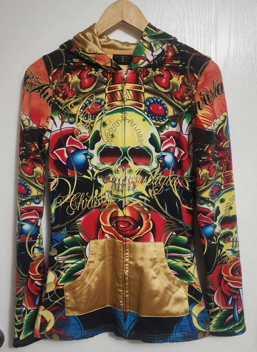 42Selling a Christian Audigier hoodie with a unique design. It features a vibrant and colourful print with skulls, roses, and other intricate details. The hoodie has a gold-toned hood lining. It is in excellent like new condition Pickup only Cash Only Thank You very much