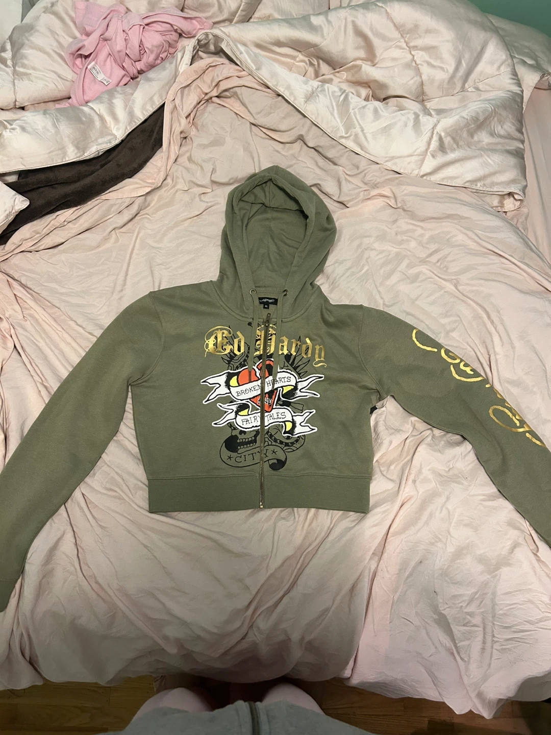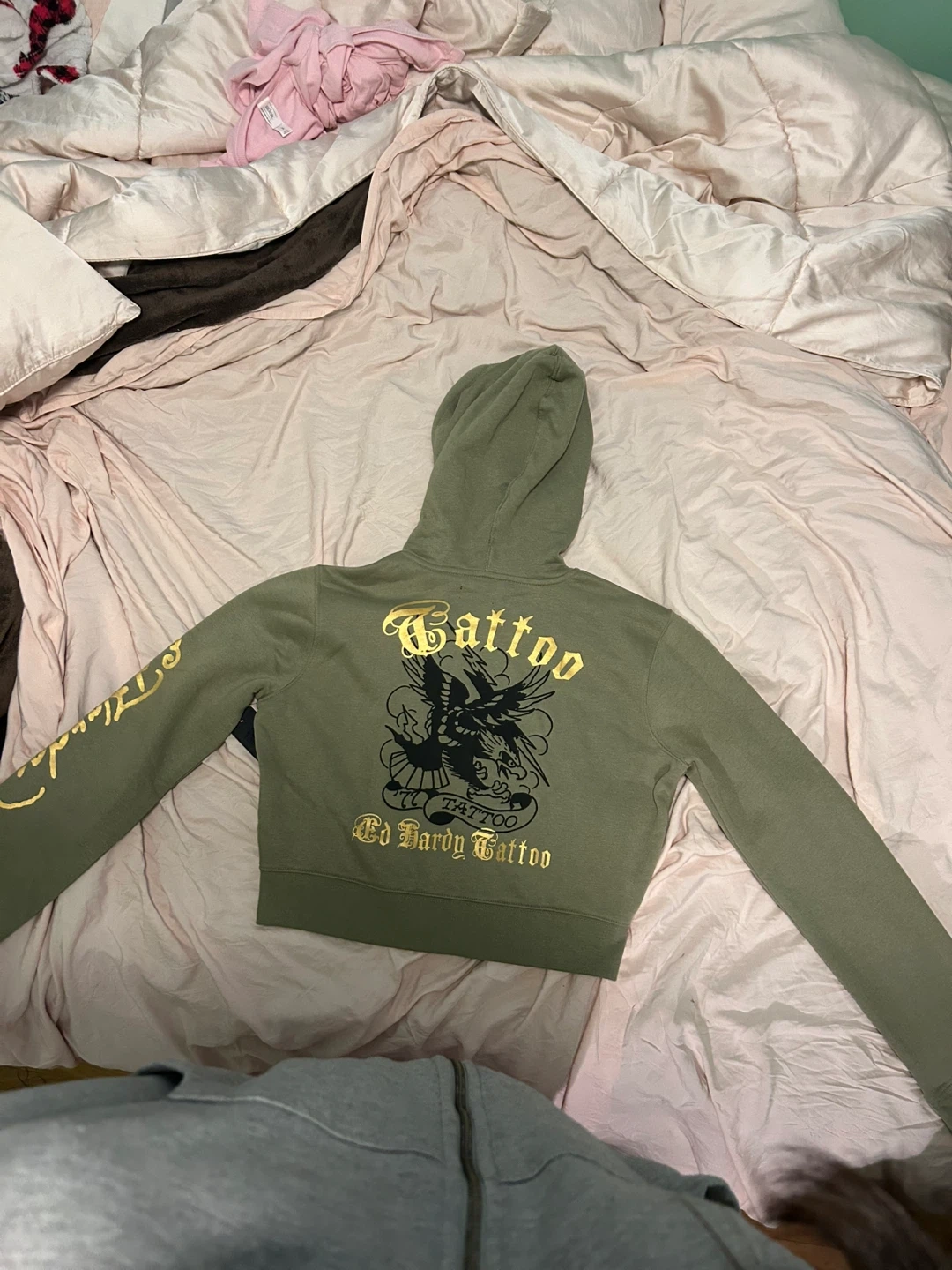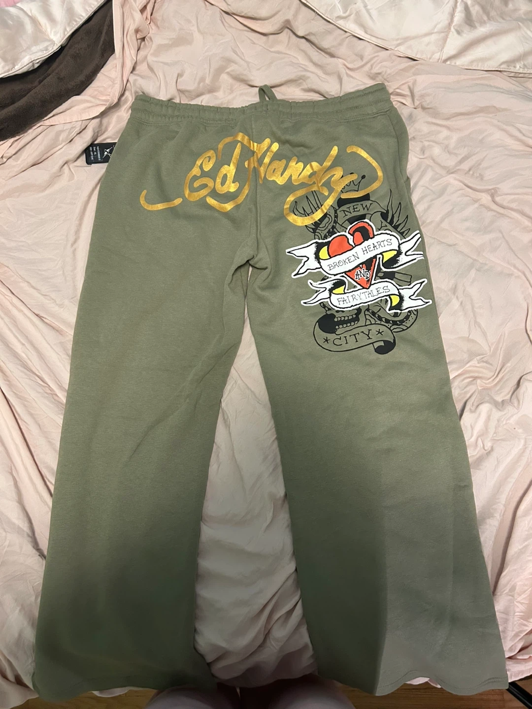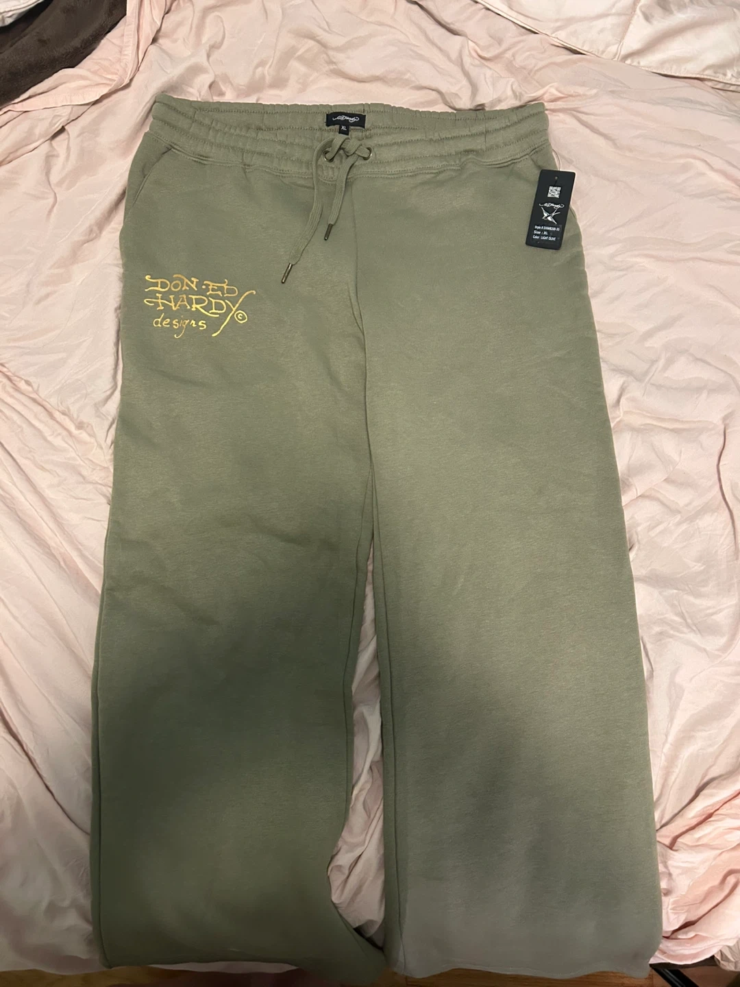 15Selling a matching Ed Hardy set in olive green. The hoodie features a cool tattoo design on the back, and both pieces have the classic Ed Hardy style. Tags are still on, never worn, brand new. Bottoms fit like Extra large however the top fits like a medium.