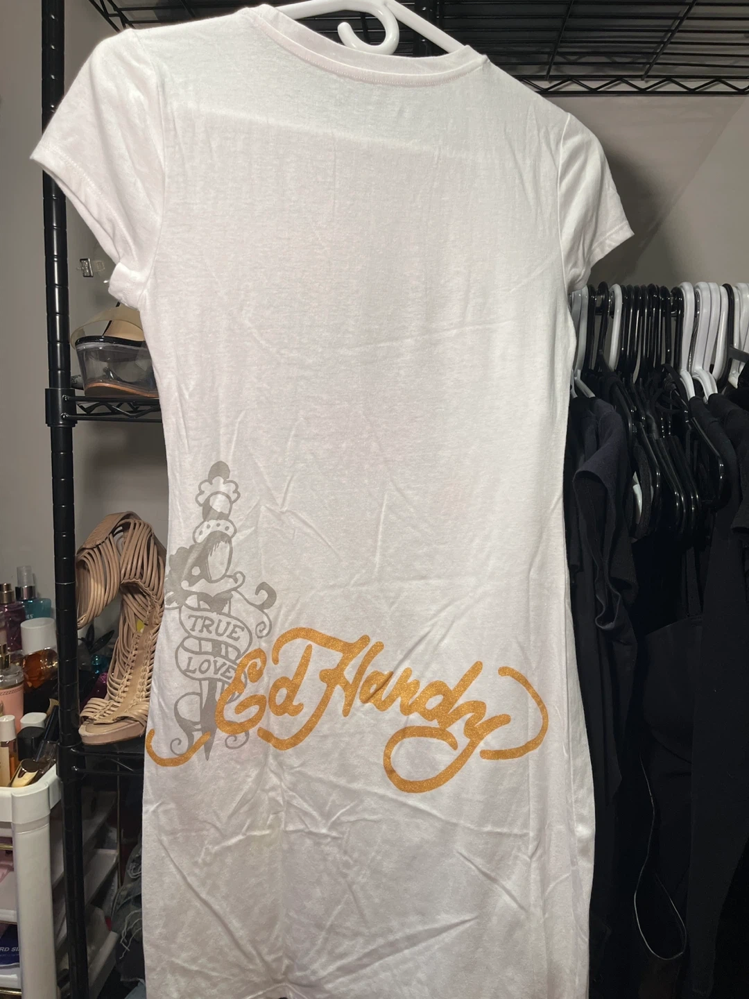 Selling a white Ed Hardy graphic dress in size small! It has a unique design with a rose, eagle, and anchor graphic. In good condition. Meetup or pickup - message if interested