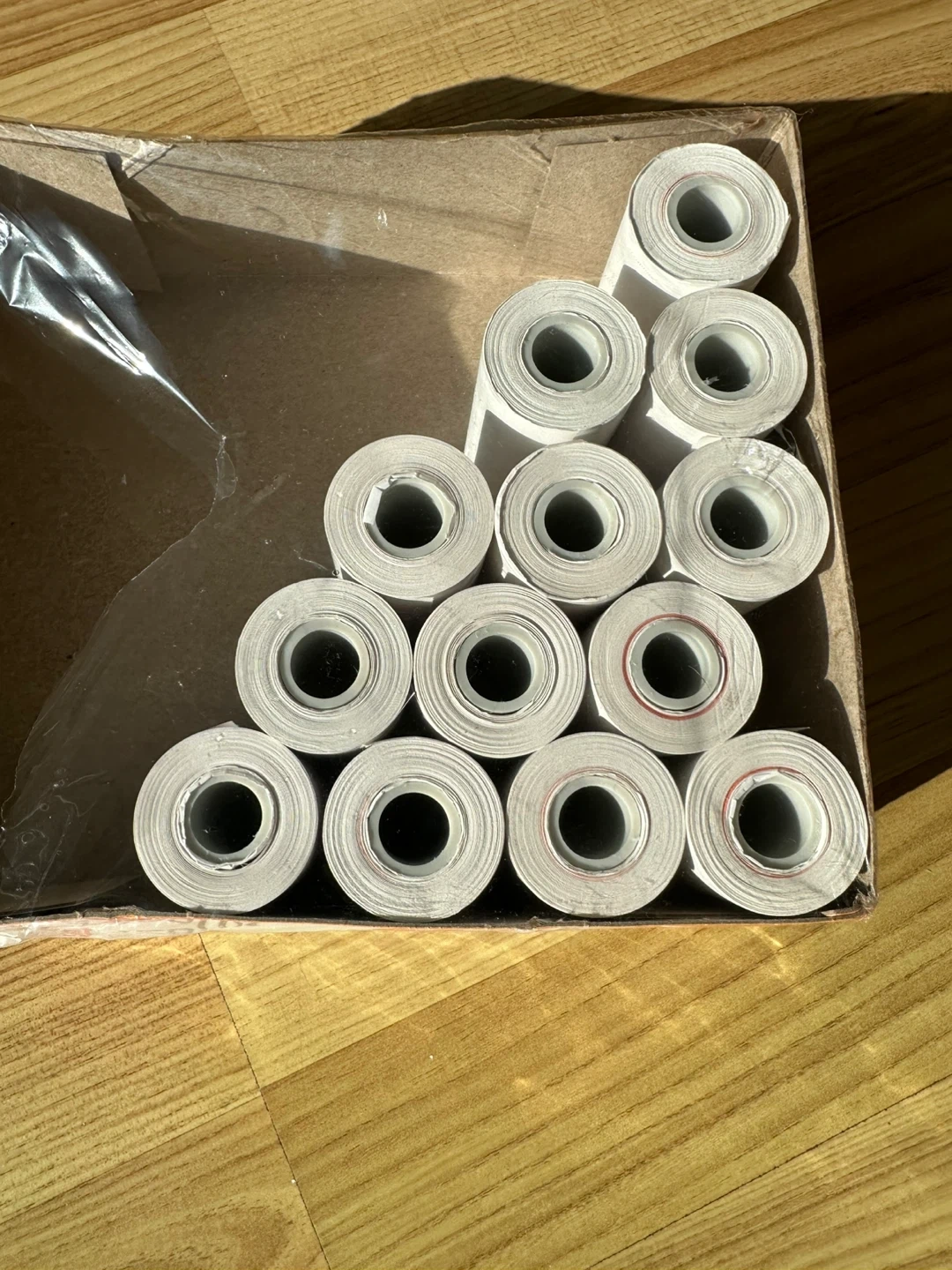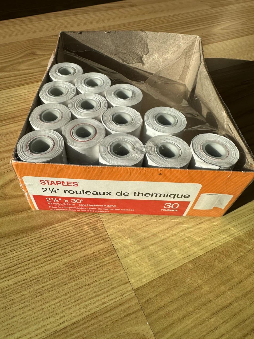 Box of 13 thermal paper rolls. Each roll is 2 1/4 inches by 30 feet. For point-of-sale printers and cash registers. Uses BPA-free paper.