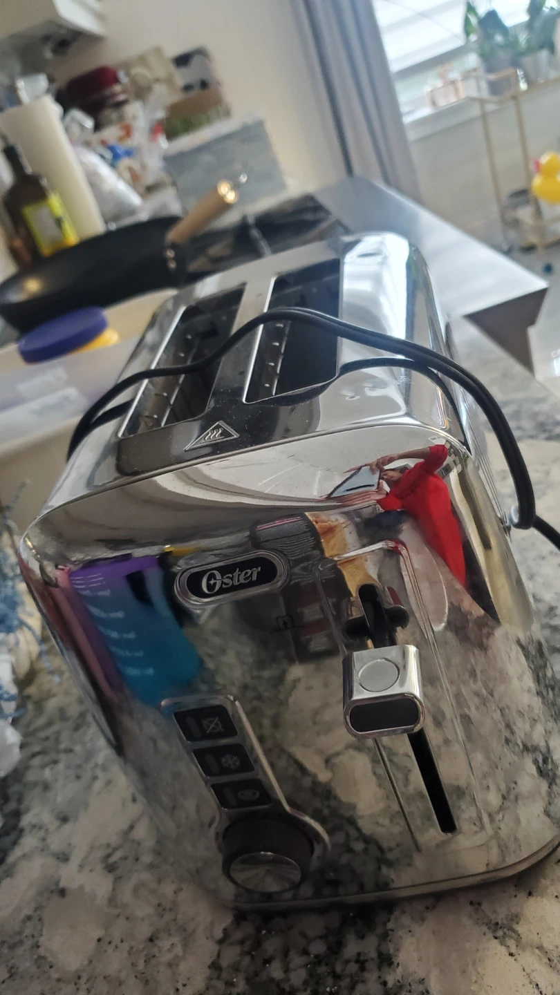 This is an Oster 2-slice toaster with a shiny chrome finish. It has a dial for browning control and buttons for defrost, reheat, and cancel functions. Great for quick breakfasts!