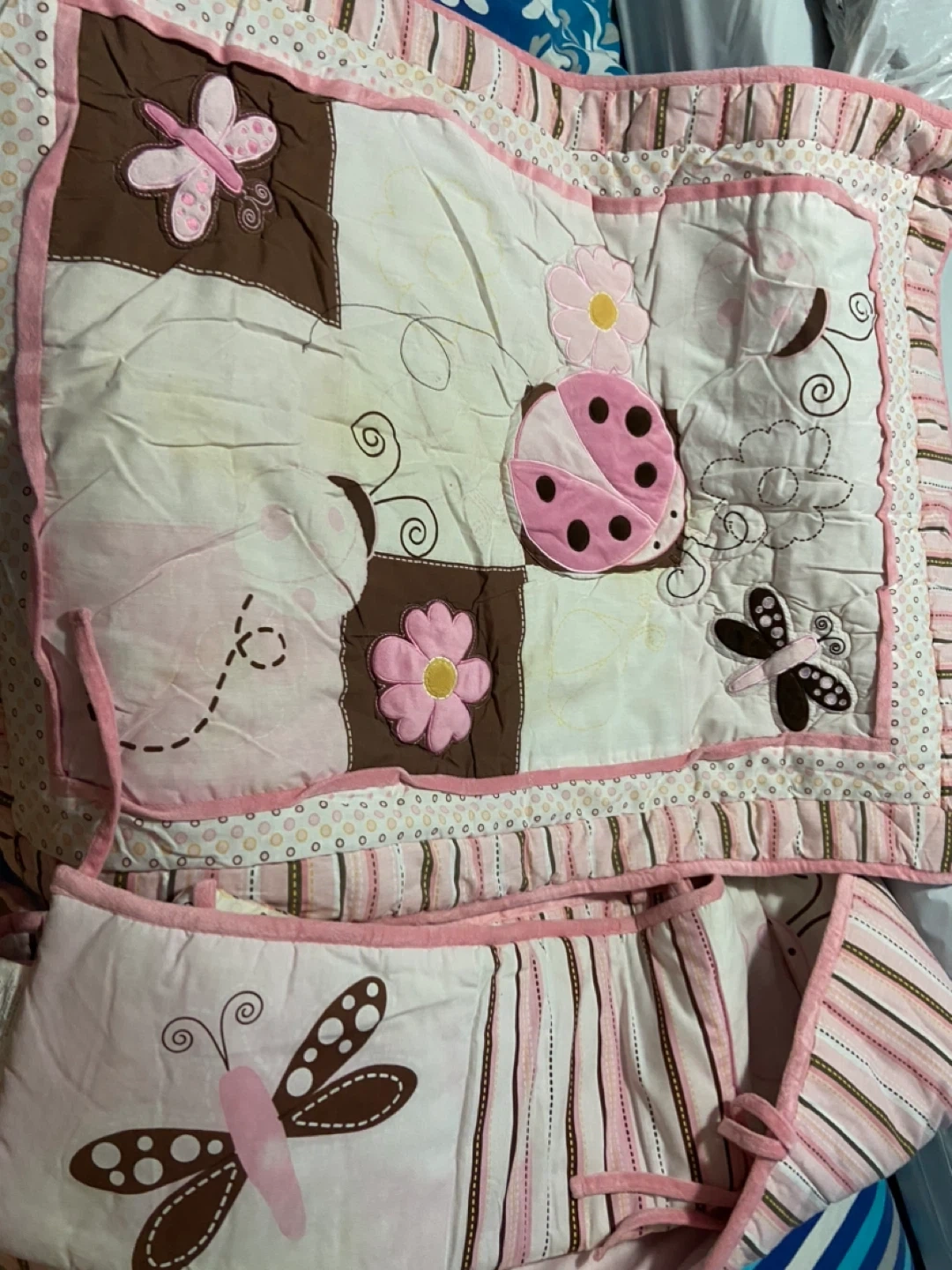 A cute baby crib bedding set with butterfly, ladybug, and flower designs. Perfect for adding a touch of whimsy to your little one's nursery!