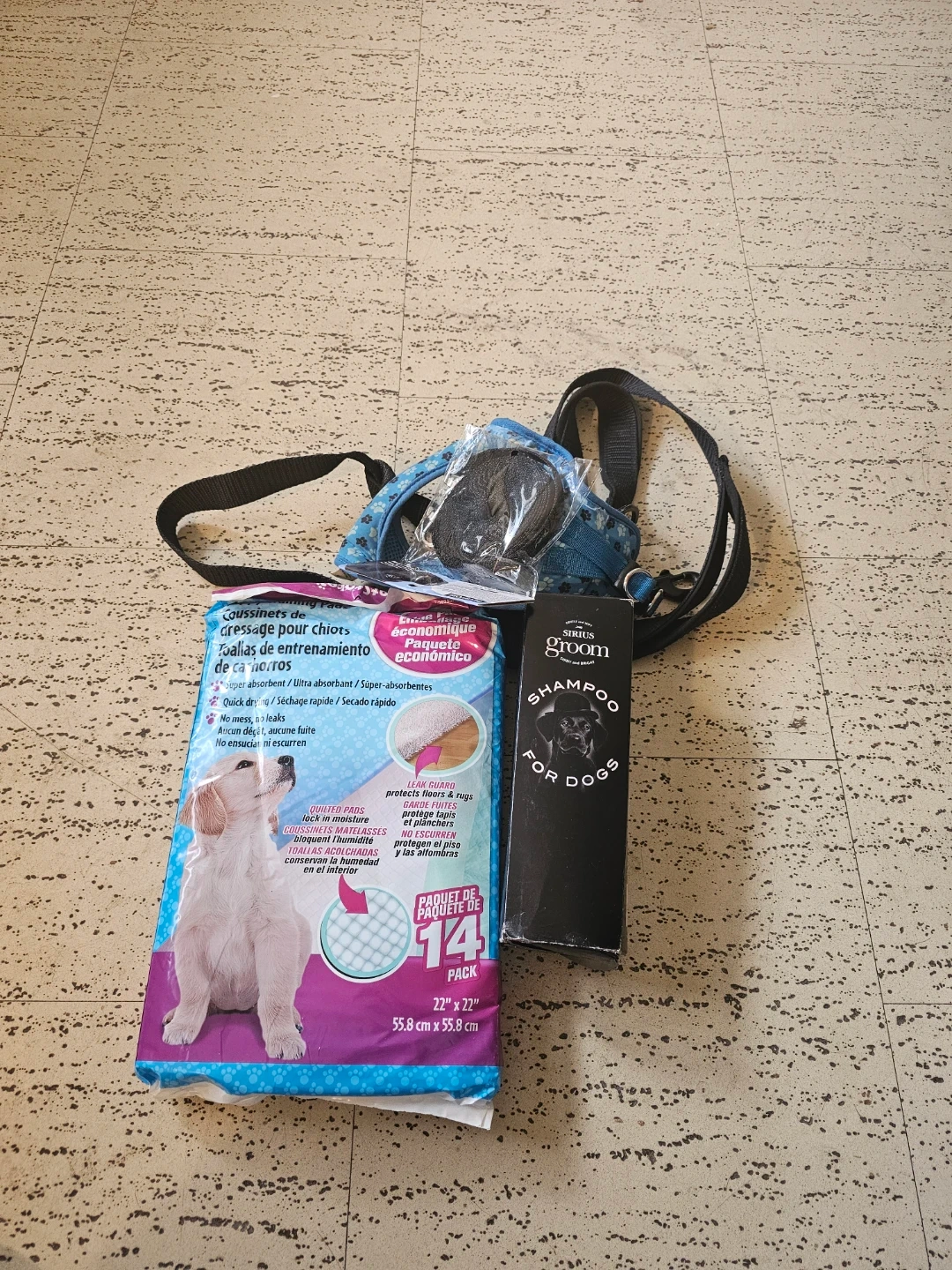 This bundle includes a pack of 14 large, super absorbent dog training pads, measuring 22" x 22". It also comes with Sirius Groom shampoo for dogs. The pads offer quick drying and a leak guard to protect floors.