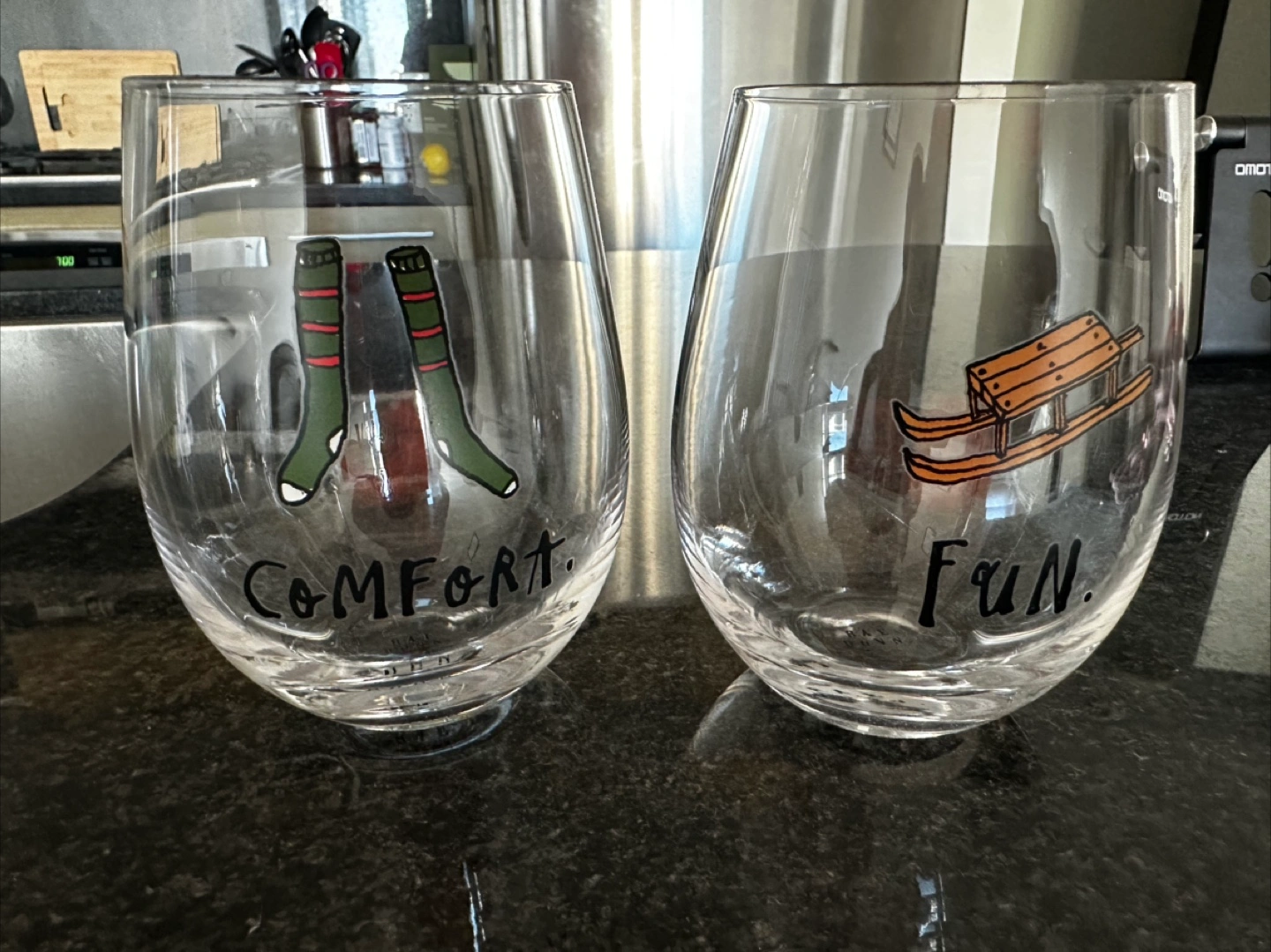 Two stemless wine glasses, one with a cozy socks design labeled 'Comfort' and the other with a sled design labeled 'Fun' - Rae Dunn.