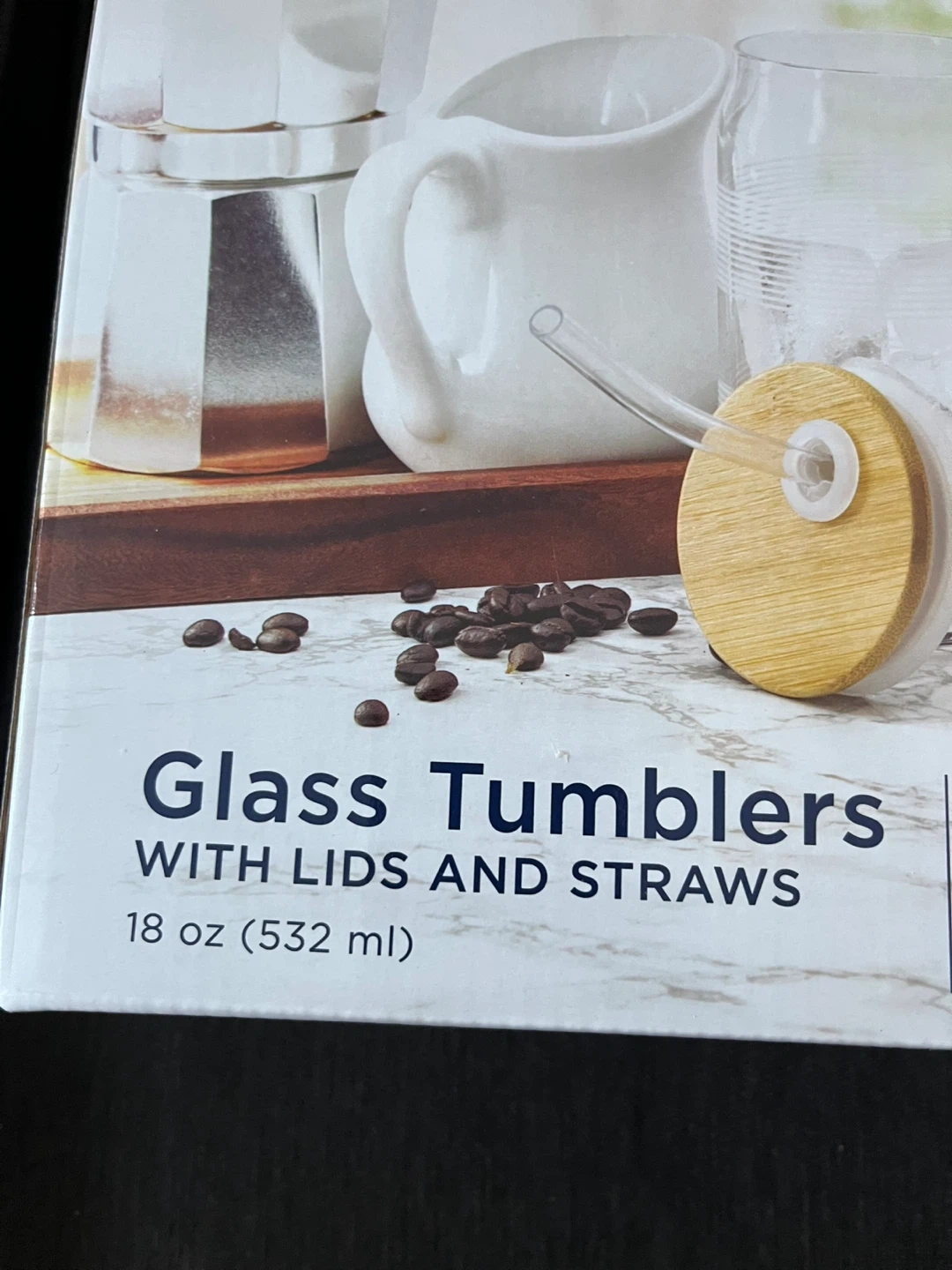 Selling a set of Gourmet Basics by Mikasa glass tumblers! This set includes four pieces, each with lids and straws. They each hold 18 oz (532 ml). Perfect for iced coffee or any cold beverage!