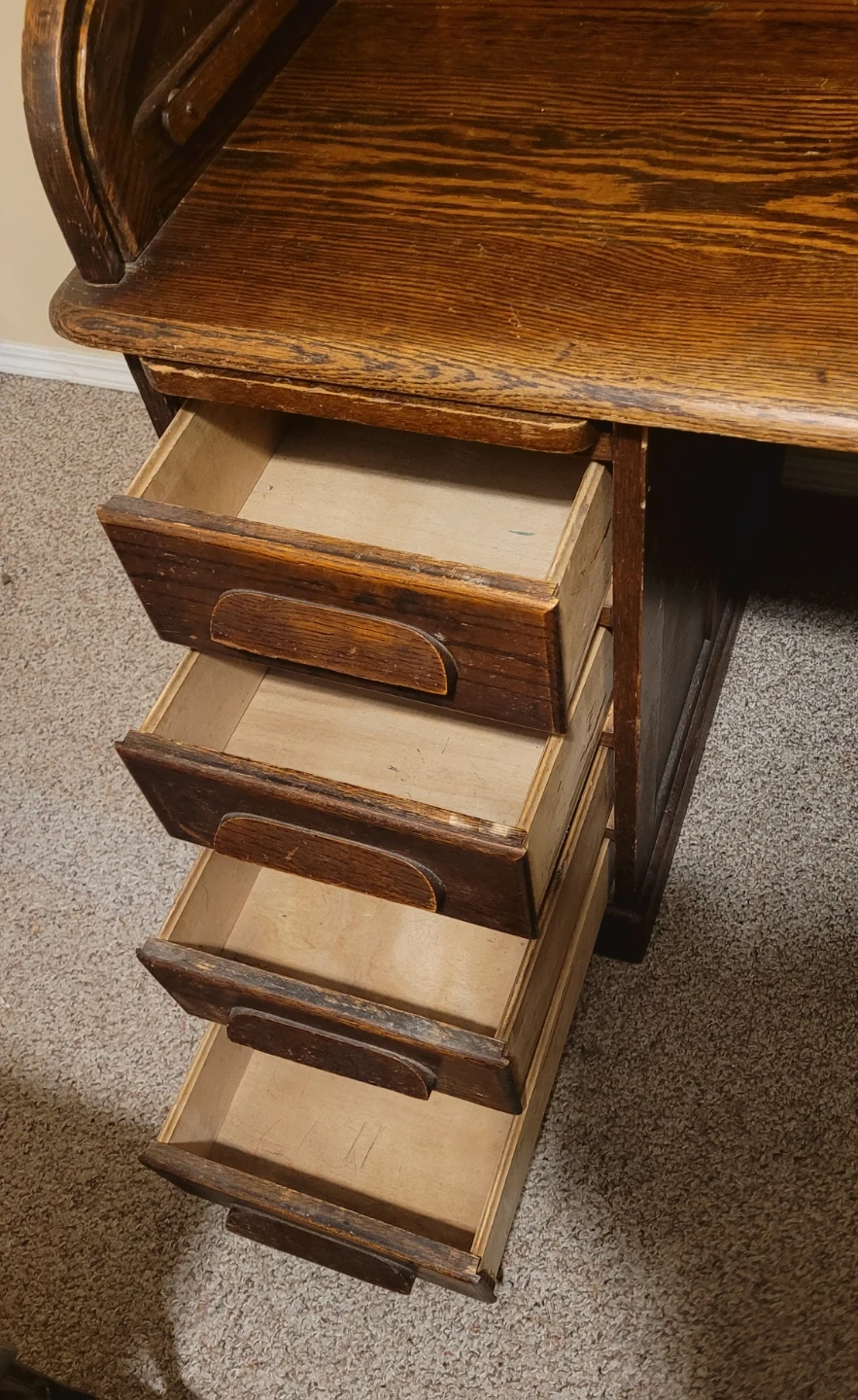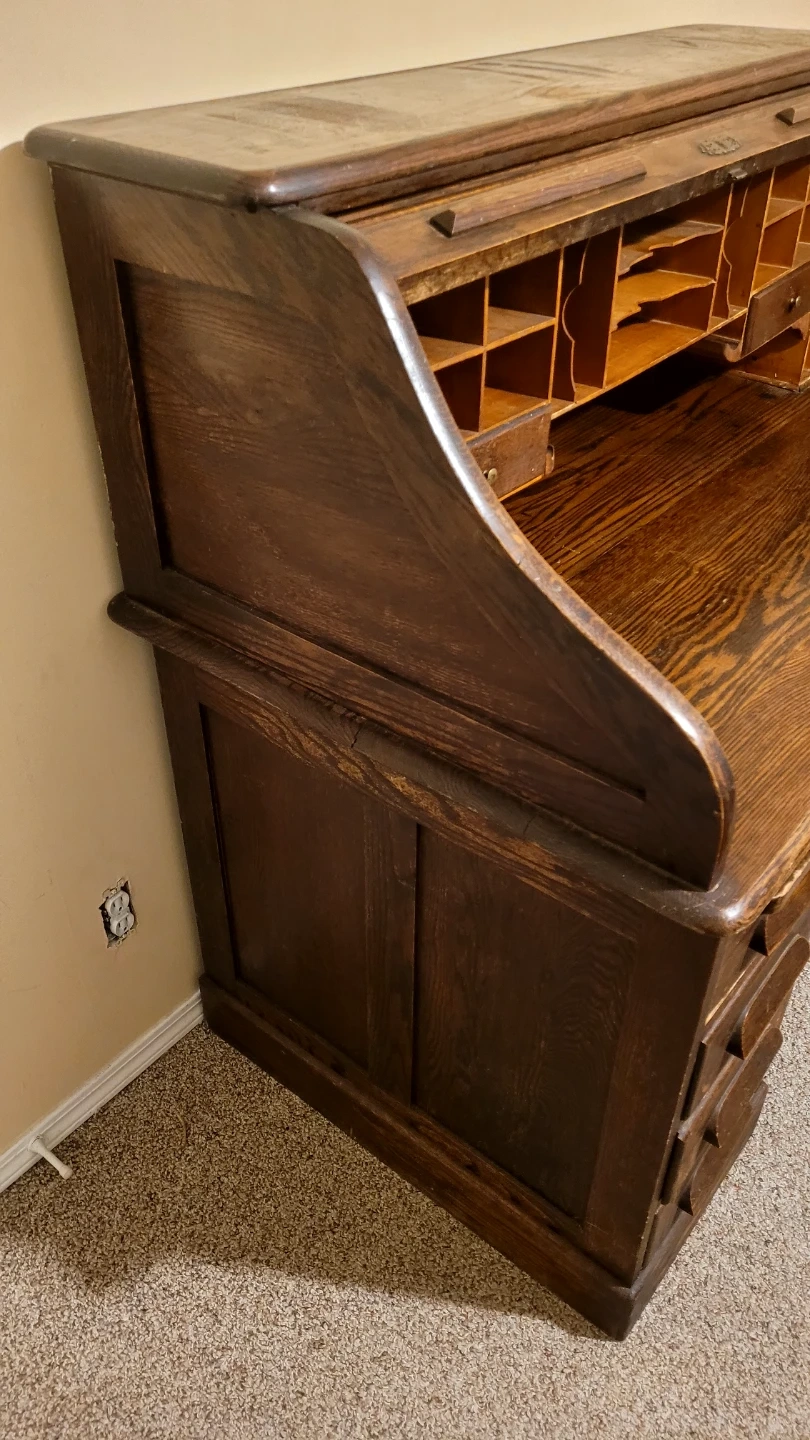 Beautiful antique oak roll top desk. Needs a little bit of care in a couple places but still a very nice desk. Top can be unscrewed from the two lower drawer parts to make transportation easier.