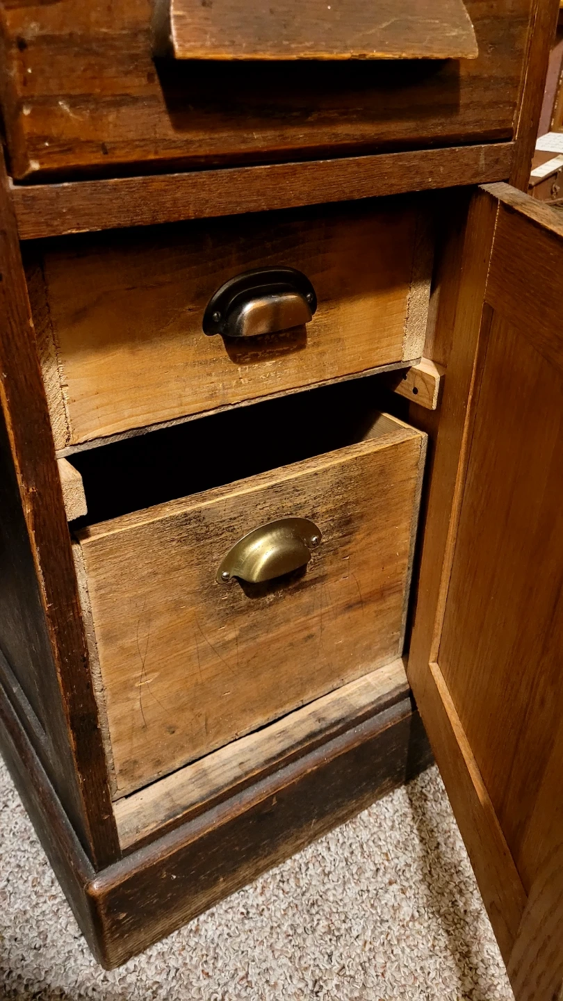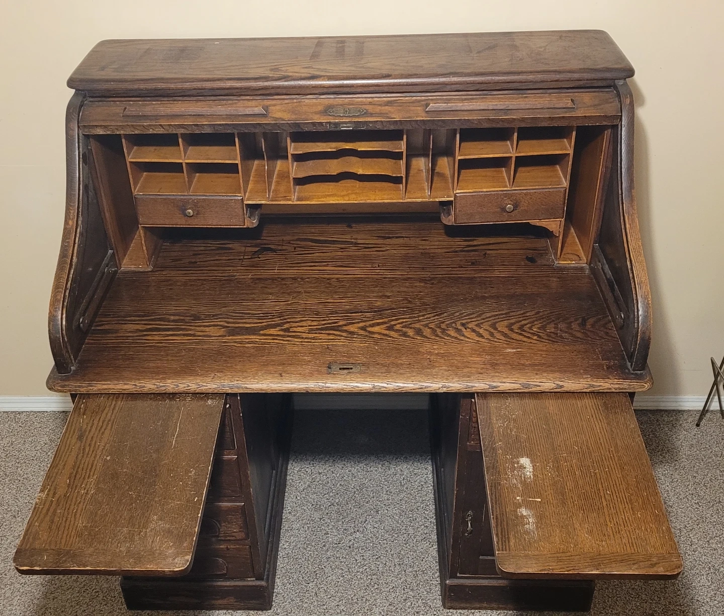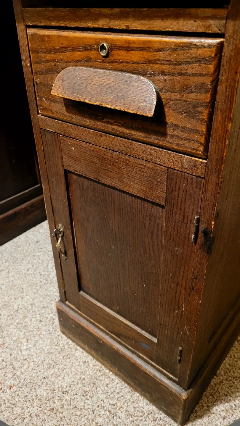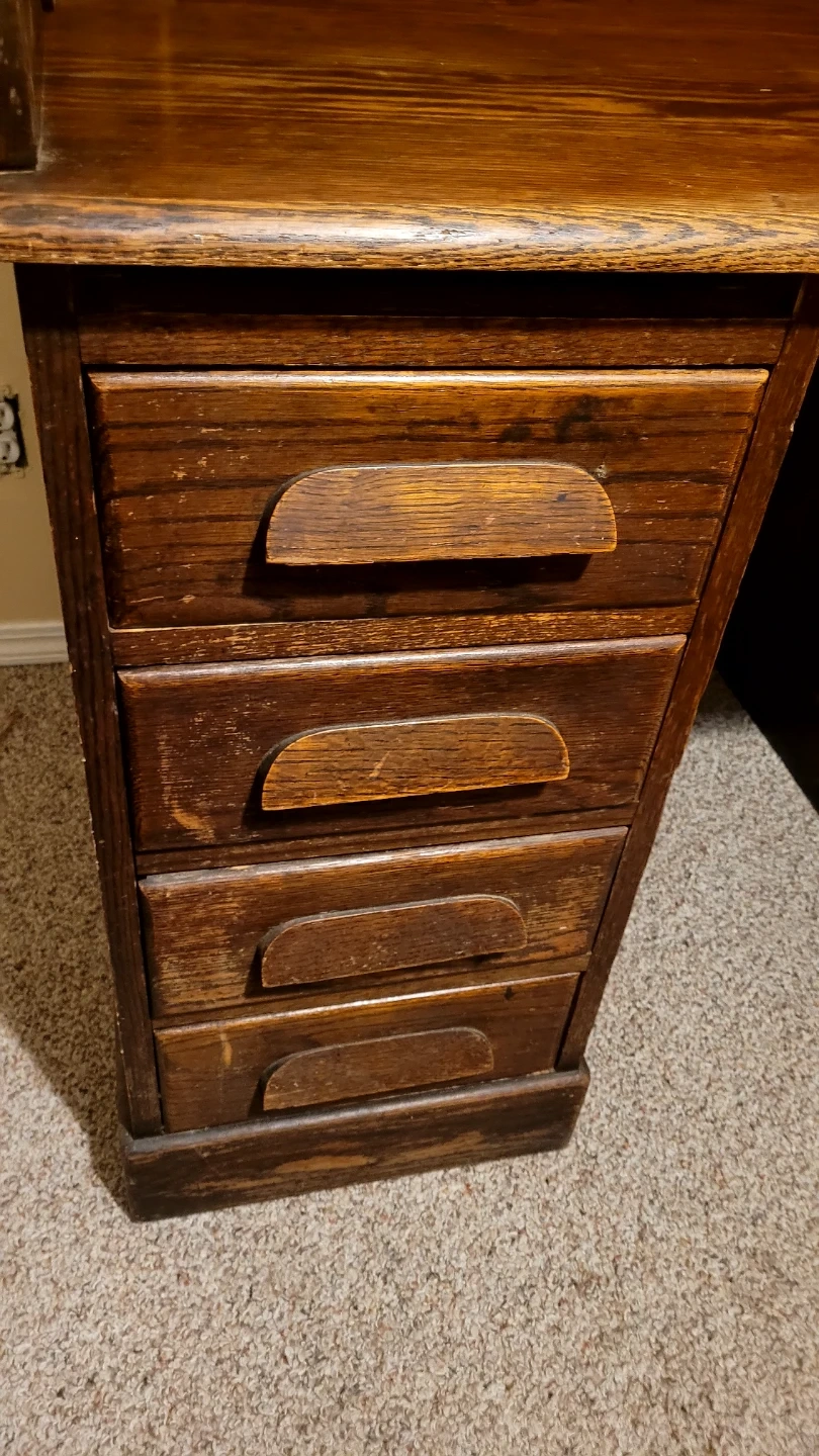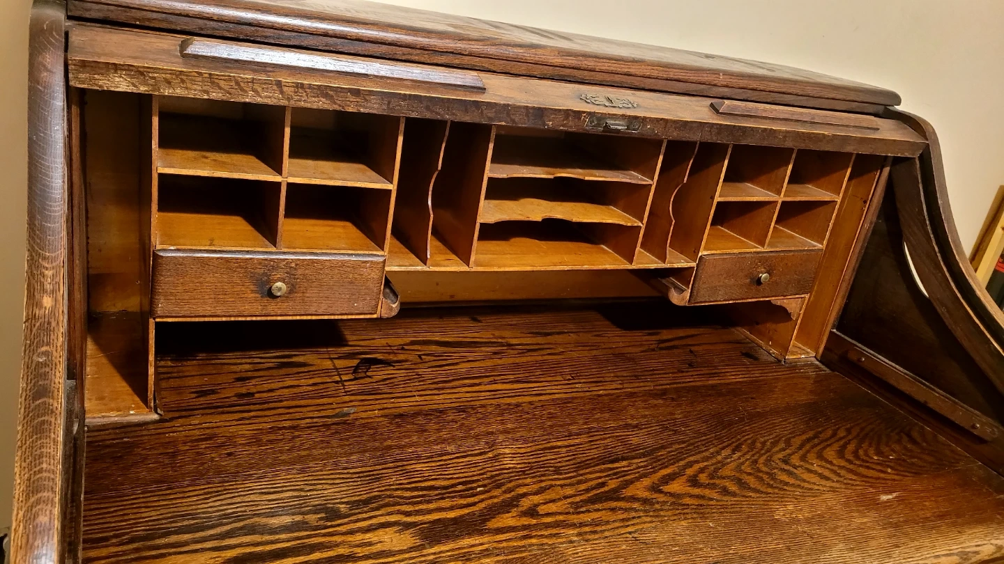 Beautiful antique oak roll top desk. Needs a little bit of care in a couple places but still a very nice desk. Top can be unscrewed from the two lower drawer parts to make transportation easier.