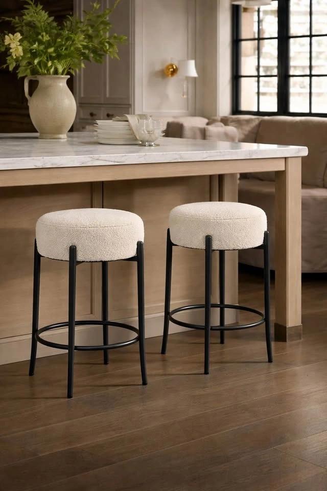 Set of 2 mid century modern sherpa stools, brand new in box. Price: $140 for the set.