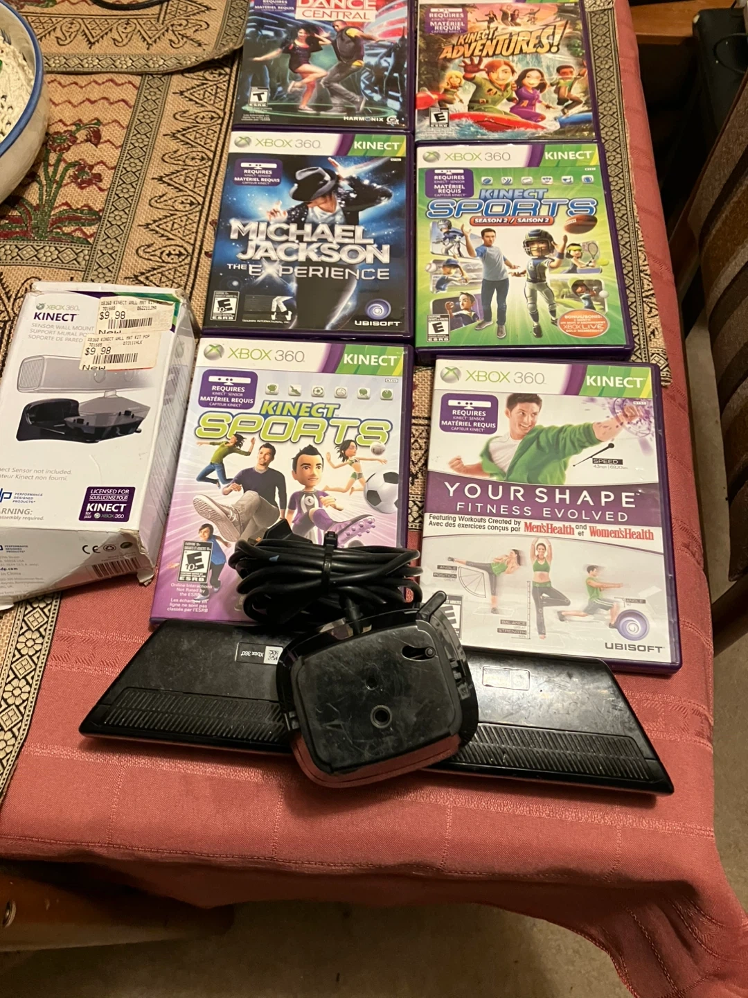 Selling an Xbox 360 Kinect sensor and a few games! Includes the sensor wall mount kit, still new in box. Games include Dance Central, Kinect Adventures, Michael Jackson The Experience, Kinect Sports Season 2, Kinect Sports, and Your Shape Fitness Evolved