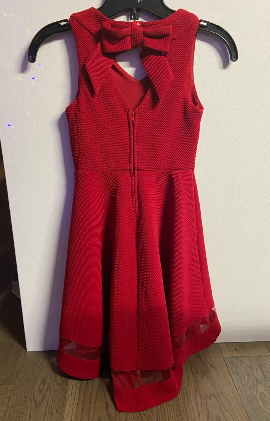 A beautiful, stylish girls red dress featuring a V-neck and a cute bow detail on the back. The dress has a textured bodice and a layered skirt with sheer accents. Longer at the back. Size 6. Like new condition and smk-free. It would be perfect for the Christmas holiday season! Pick north end St Catharines near Vine/Linwell