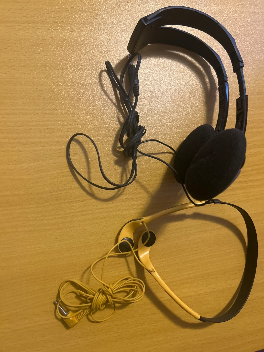 Selling two pairs of headphones. One pair is black over-ear style and the other is yellow earbud style. Both come with cords and jack connectors.