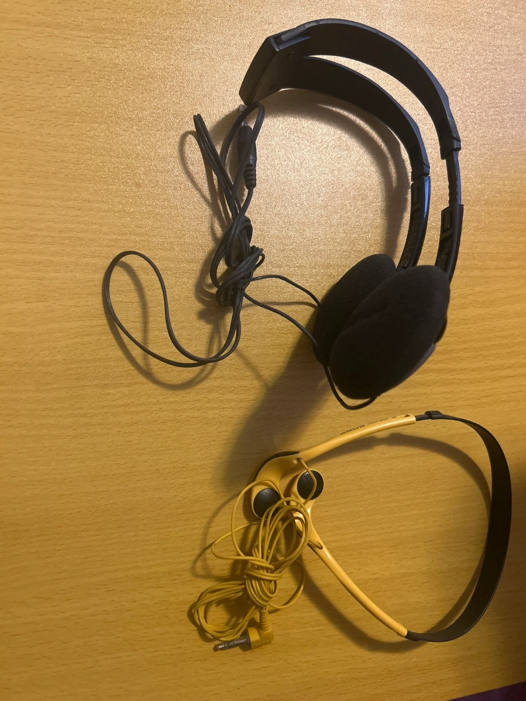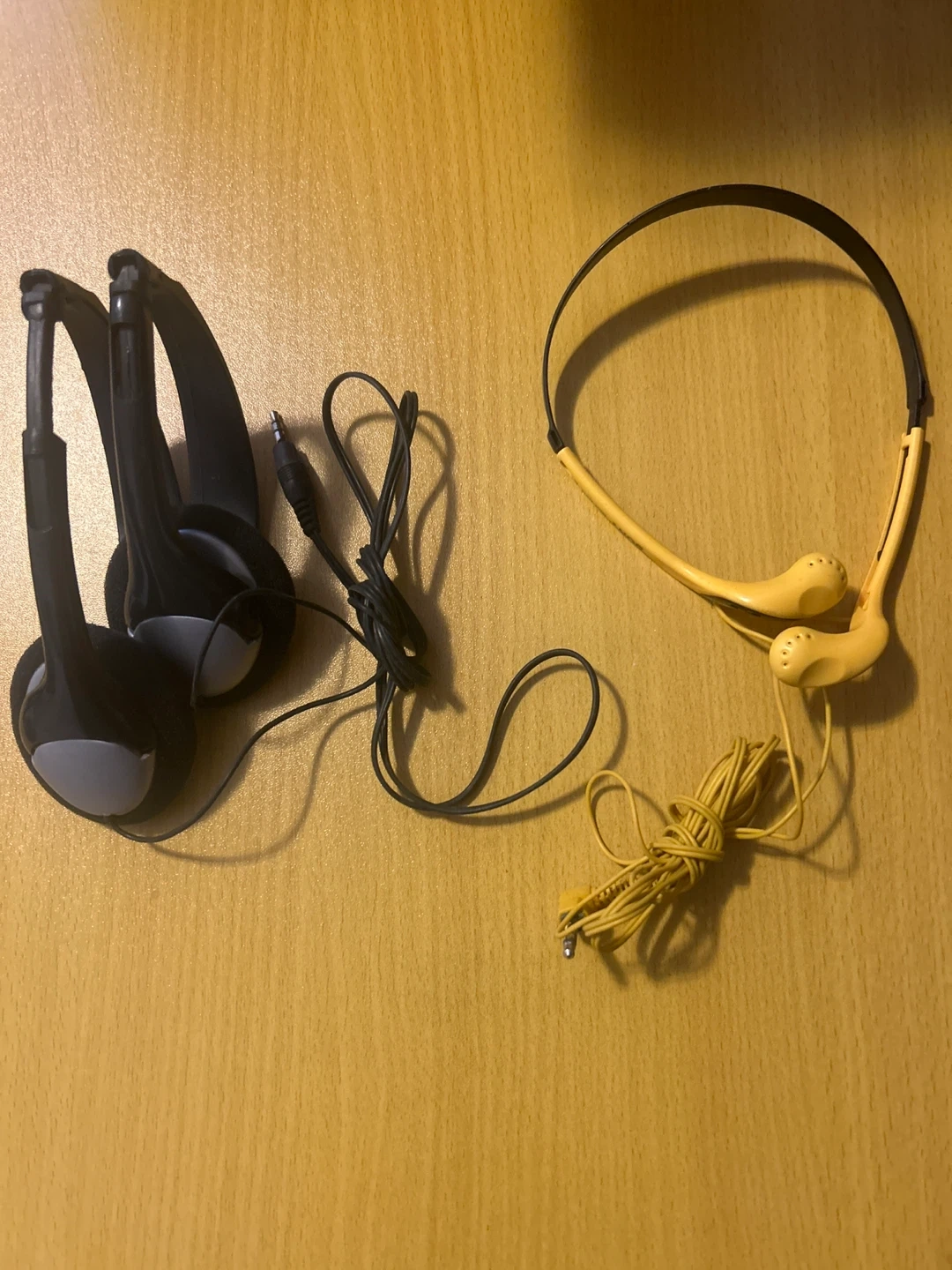 Selling two pairs of headphones. One pair is black over-ear style and the other is yellow earbud style. Both come with cords and jack connectors.