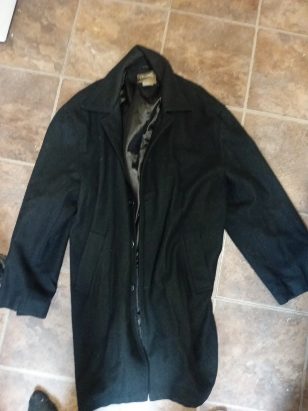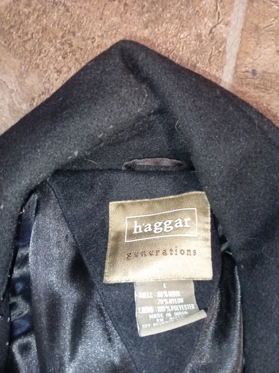 This is a Haggar Generations wool blend coat. It's a size large. The shell is 80% wool and 20% nylon, with a 100% polyester lining. Made in India.