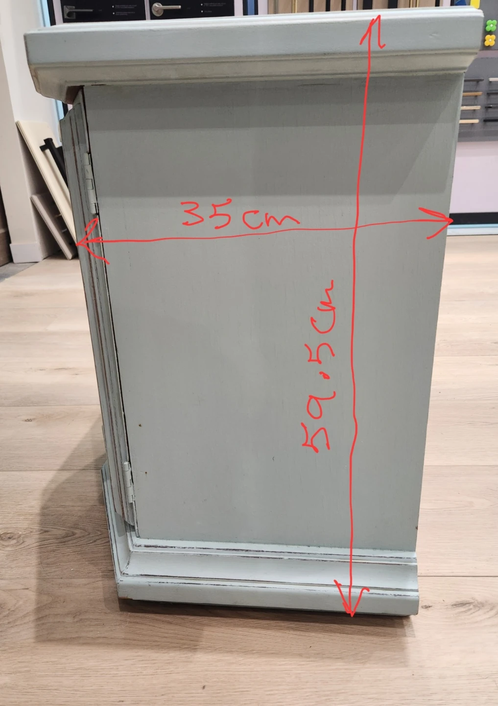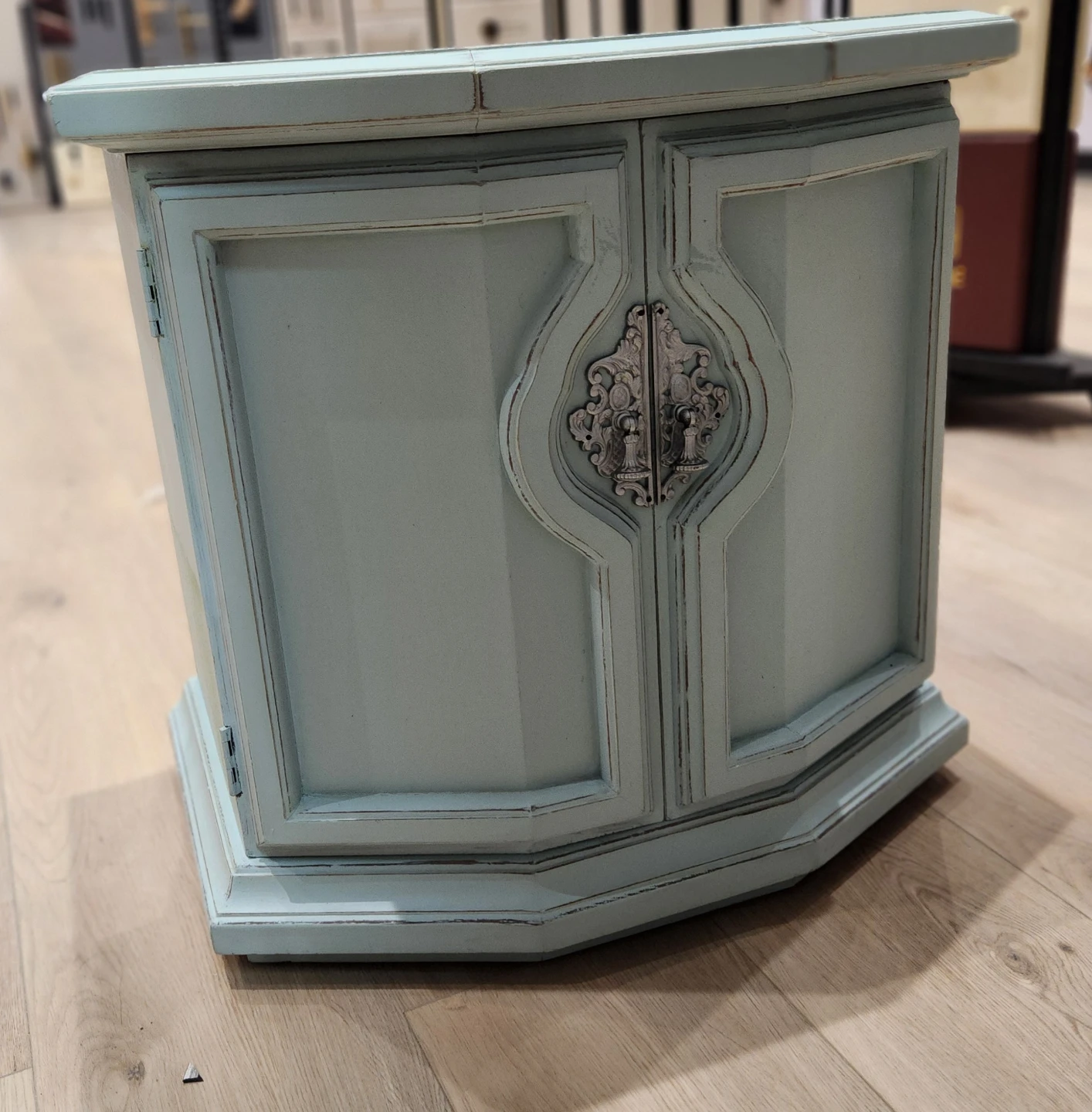 This end table cabinet has a light blue distressed finish and a carved decorative front. It features a single door opening to reveal two shelves inside. Dimensions are 44cm wide, 35cm deep, and 59.5cm high.