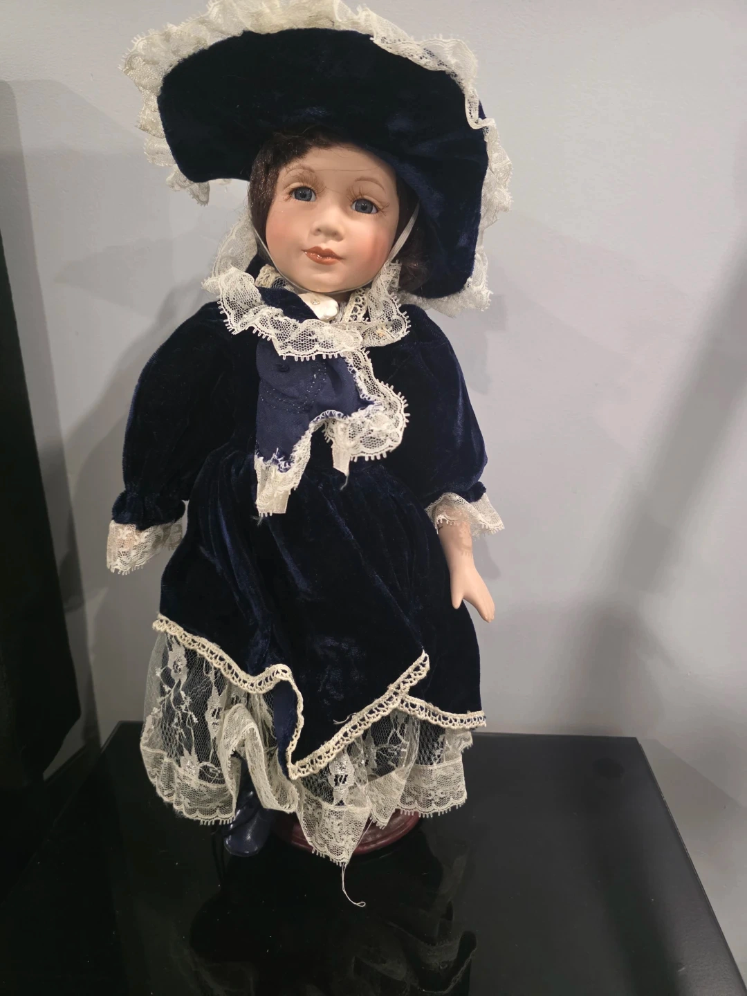 A beautiful vintage porcelain doll dressed in a lovely blue velvet dress with white lace trim. She's a charming addition to any collection or a delightful gift for someone special