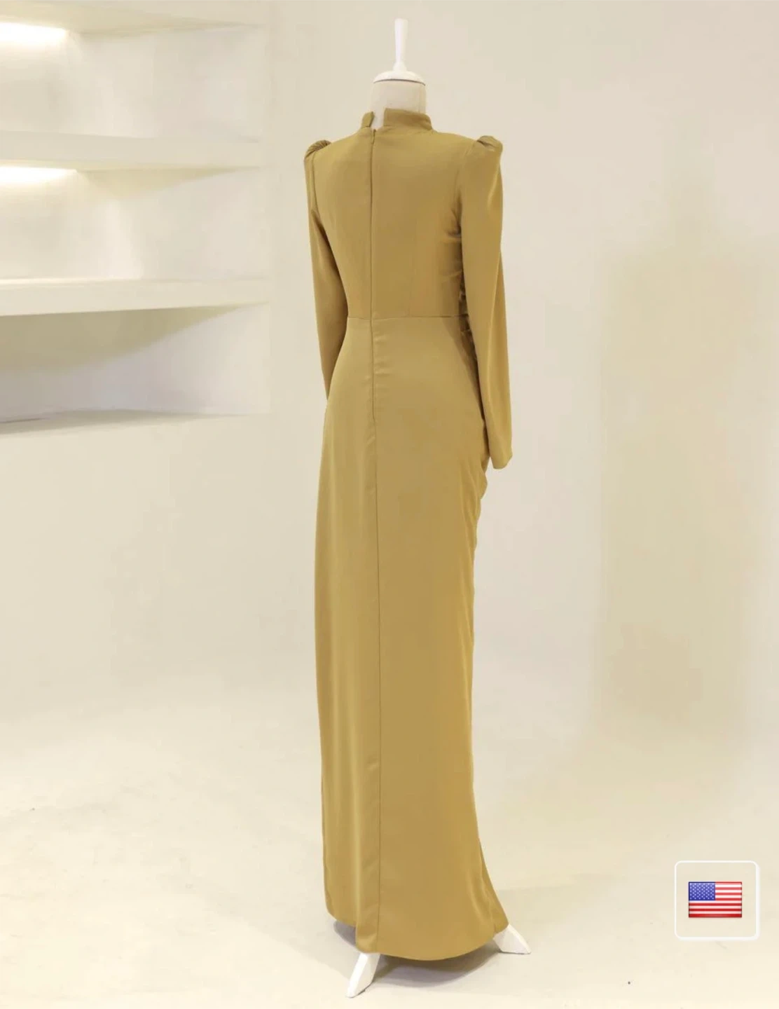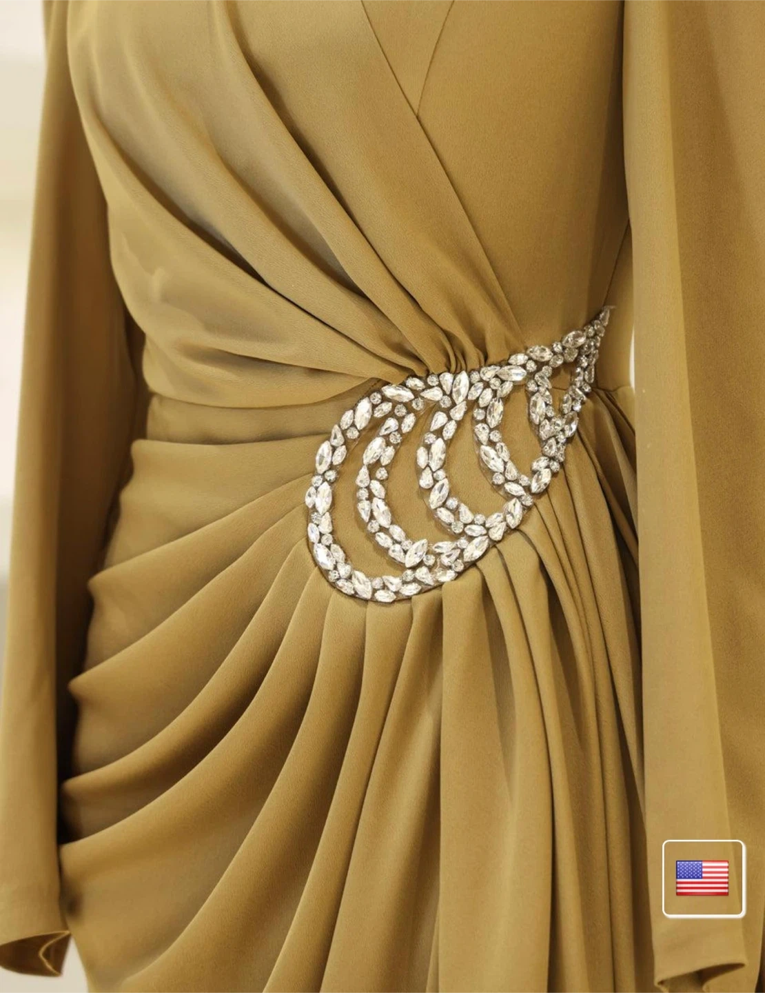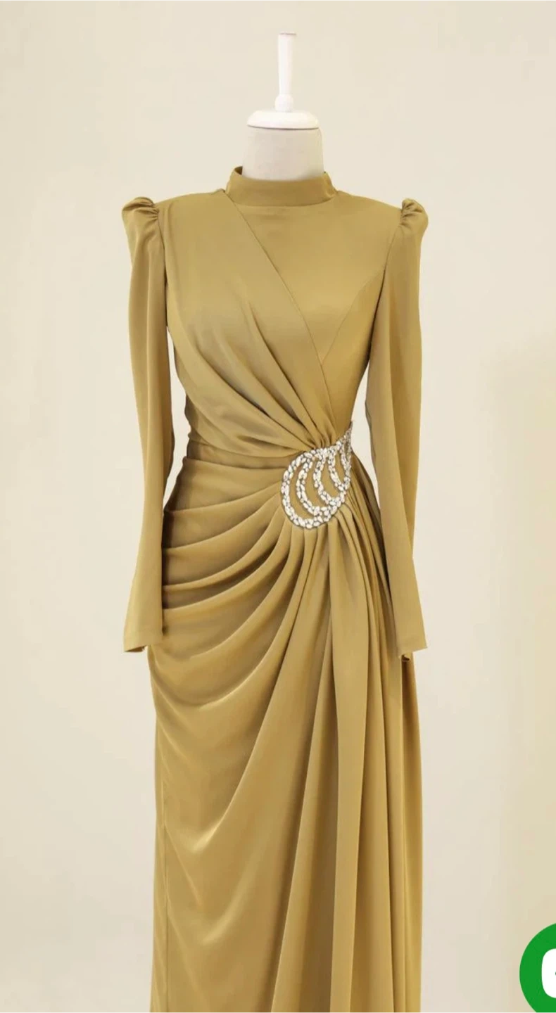 This elegant maxi dress features a sophisticated gold hue and intricate draping. It showcases a stunning jewelled embellishment on the side for a touch of glamour. The long sleeves and high neckline add to its refined silhouette.