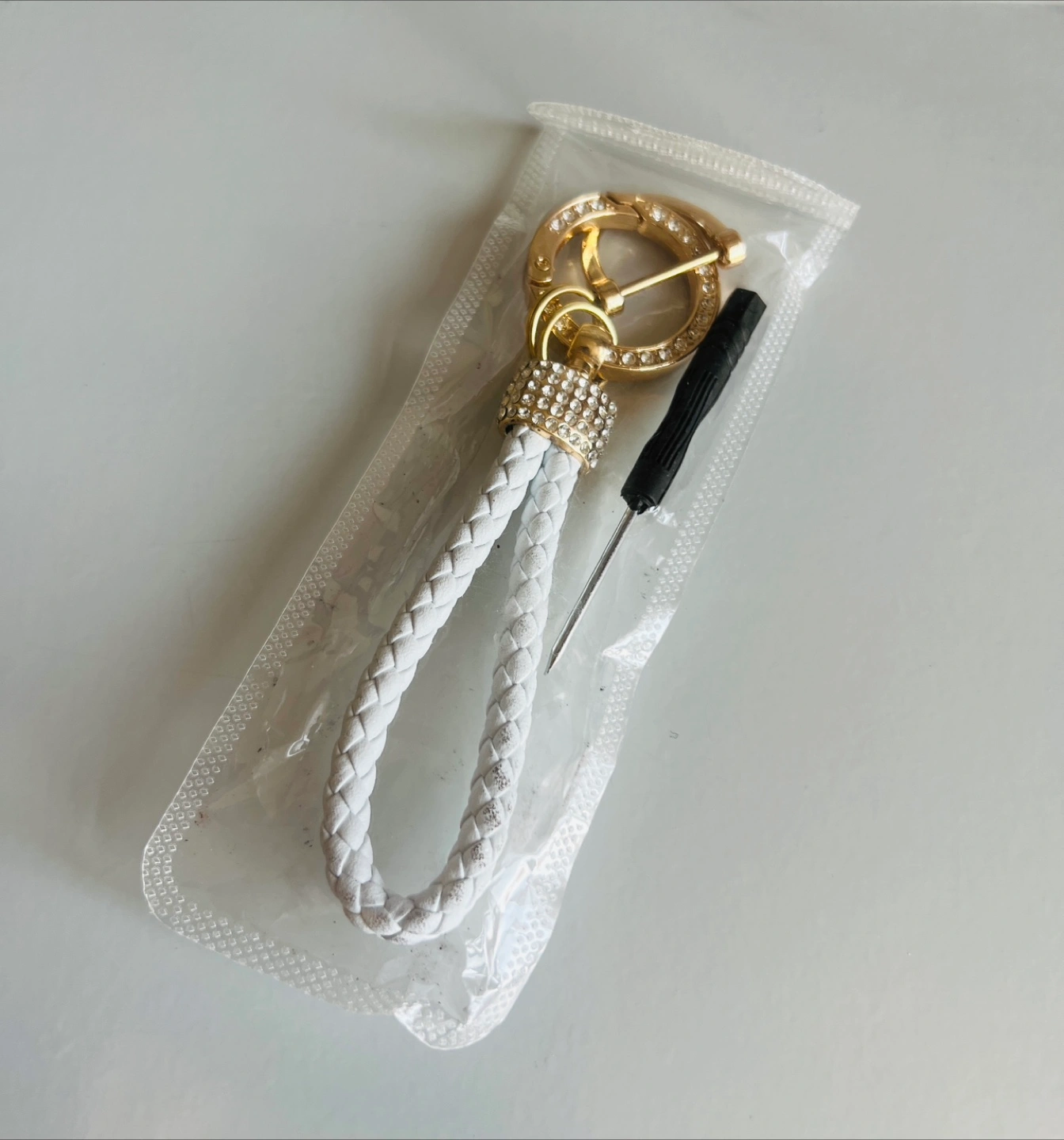 Cute rhinestone keychain with a braided white strap and gold accents! It comes with a little screwdriver as well. Perfect for adding a bit of sparkle to your keys or bag