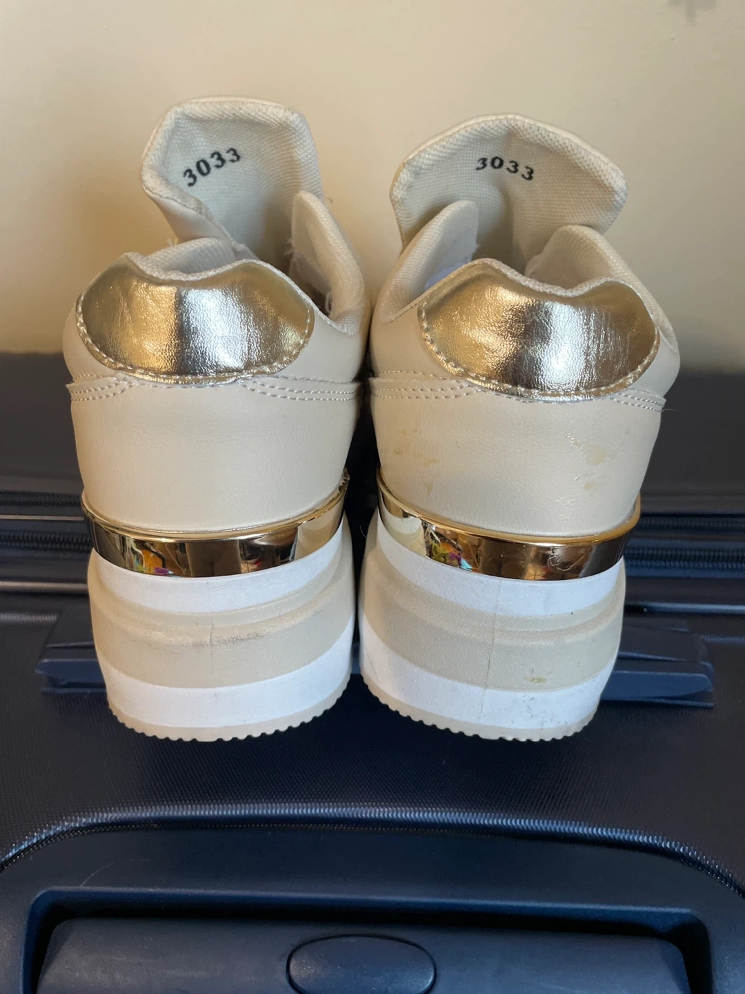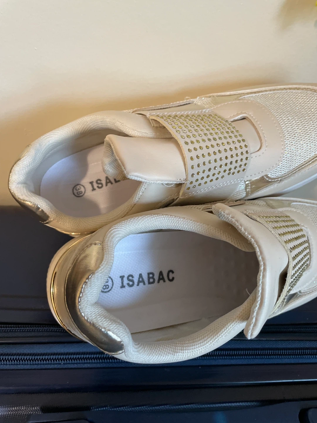 Selling a pair of Isabac sneakers in beige with gold accents. They're a women's size 8. These stylish sneakers are in perfect condition, purchased in Europe .