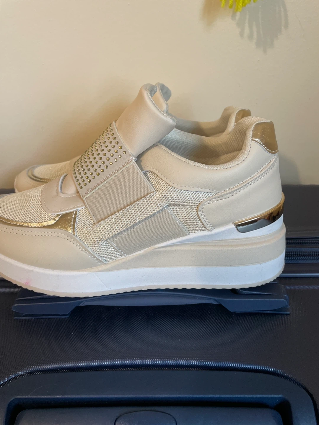 Selling a pair of Isabac sneakers in beige with gold accents. They're a women's size 8. These stylish sneakers are in perfect condition, purchased in Europe .