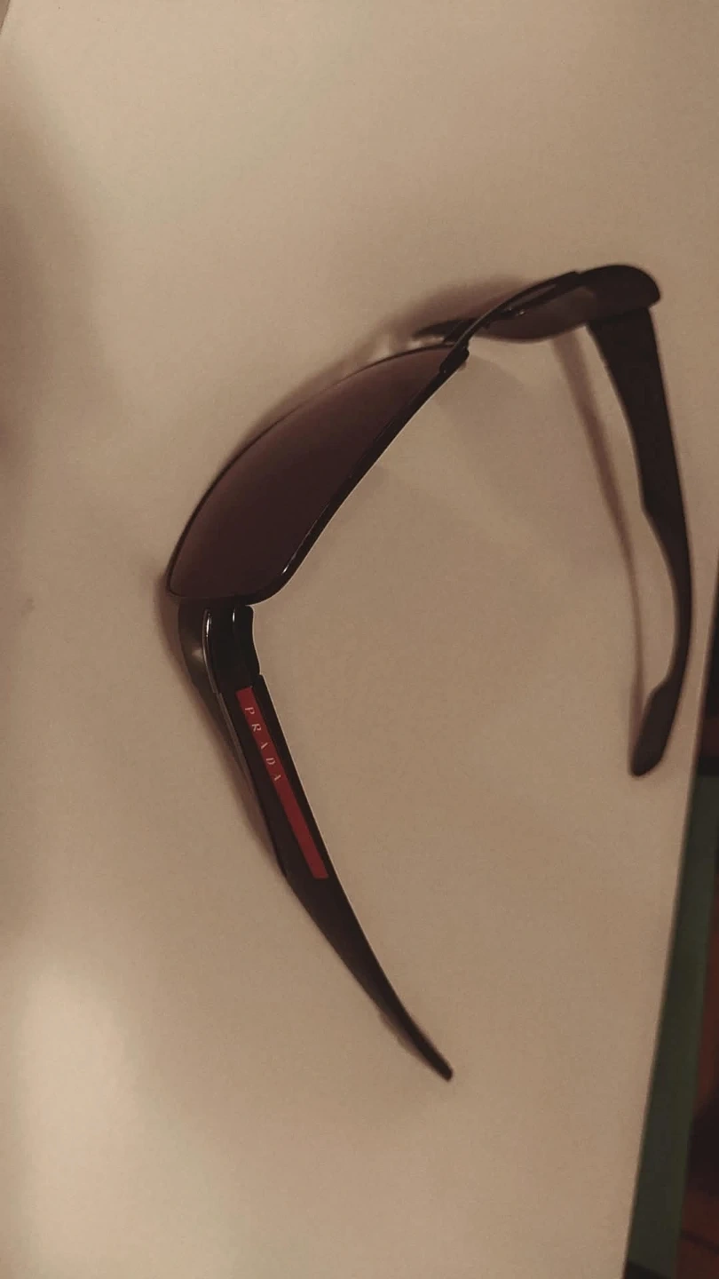 Authentic Prada Linea Rossa PS 507S sunglasses. These shades feature a sleek, dark frame with tinted lenses. The iconic Prada logo is visible on the arm. They offer stylish eye protection.