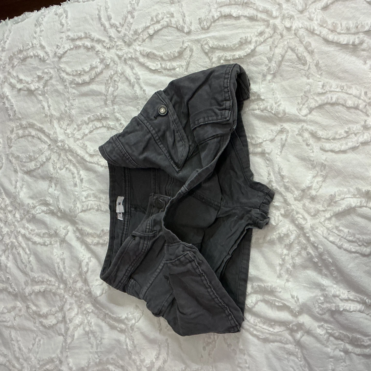 These are charcoal grey cargo skirt. They have multiple pockets with button closures. The material feels like a sturdy cotton blend.wore just once.