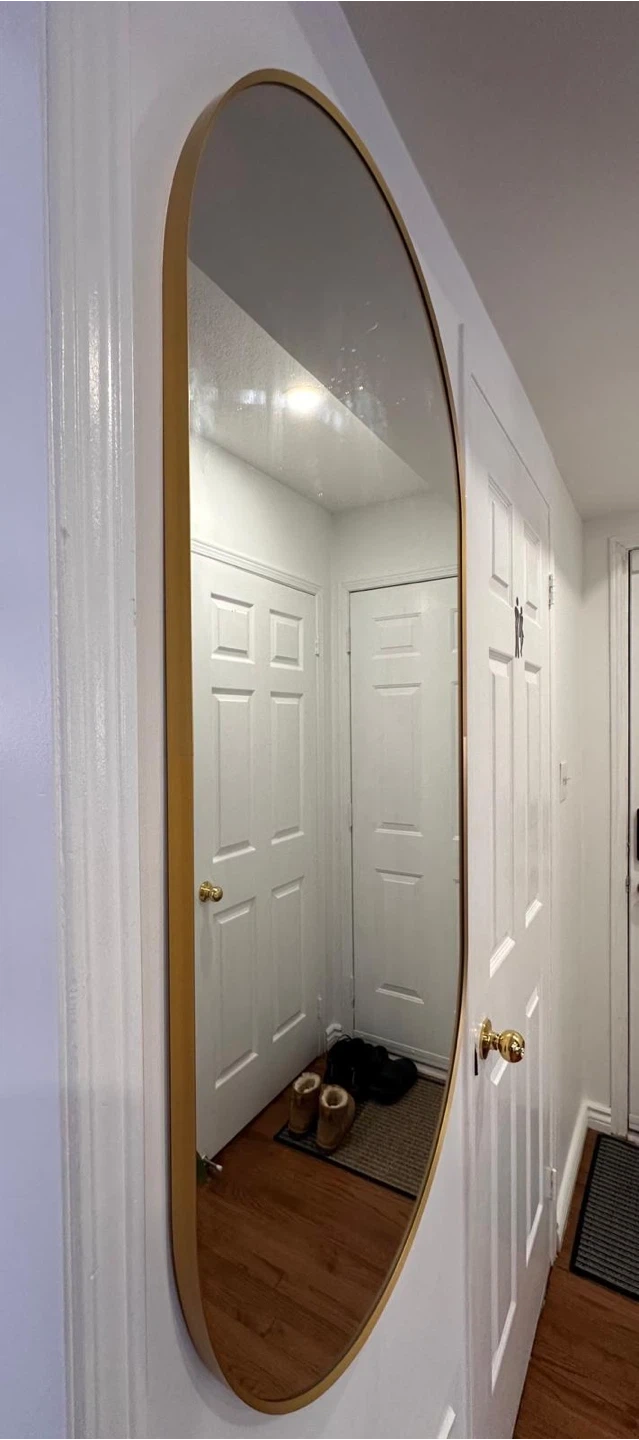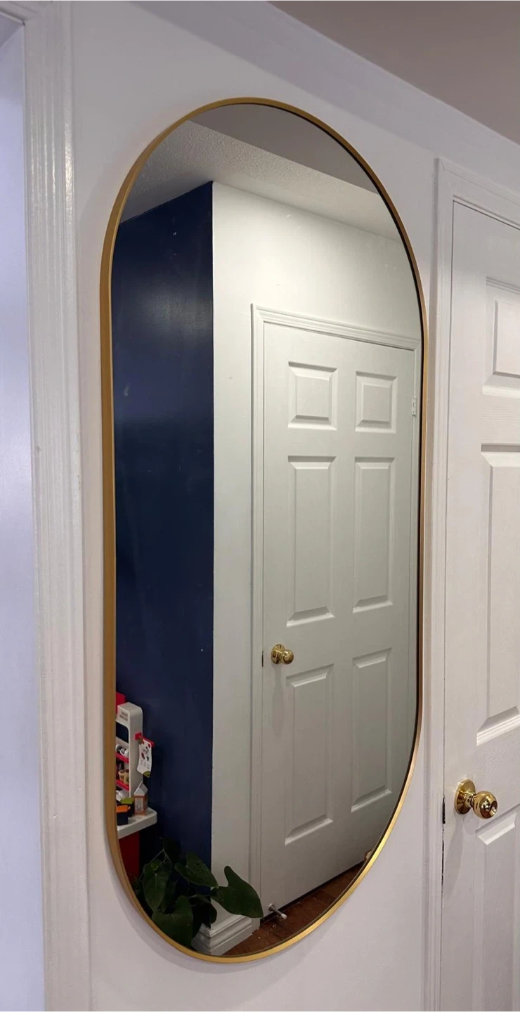 Add a touch of modern elegance to your home with this oval mirror. It features a sleek gold-toned frame, perfect for checking your reflection before heading out. The generous size makes it a functional and stylish addition to any entryway or room.