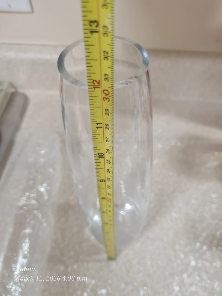 This is a tall, clear glass vase. It measures approximately 12 inches in height and about 3 inches in diameter at the opening. It's perfect for displaying flowers.