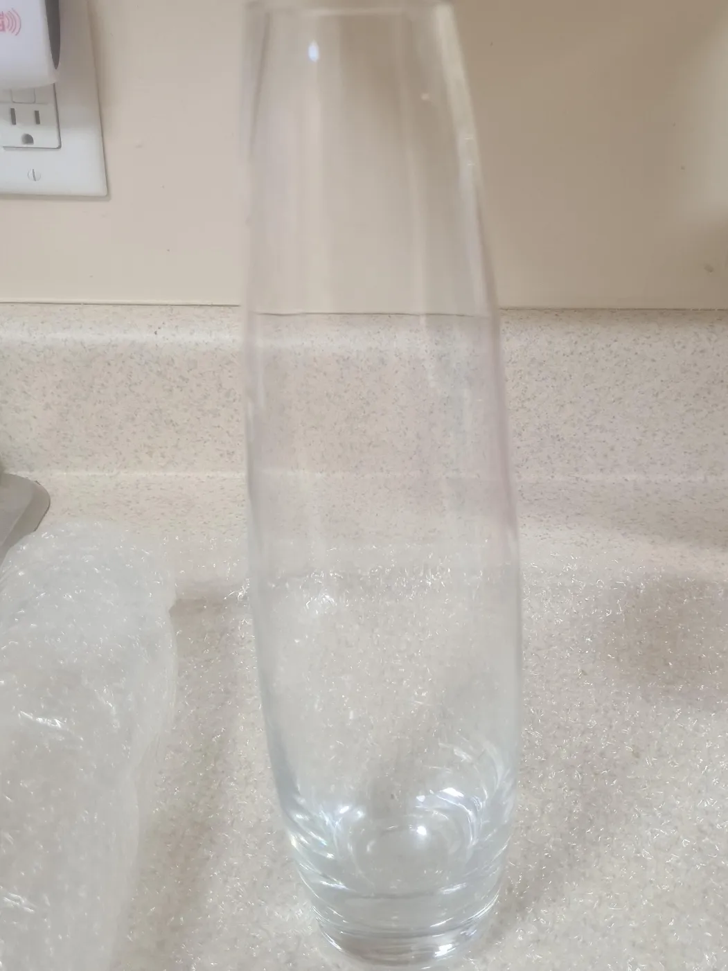 This is a tall, clear glass vase. It measures approximately 12 inches in height and about 3 inches in diameter at the opening. It's perfect for displaying flowers.