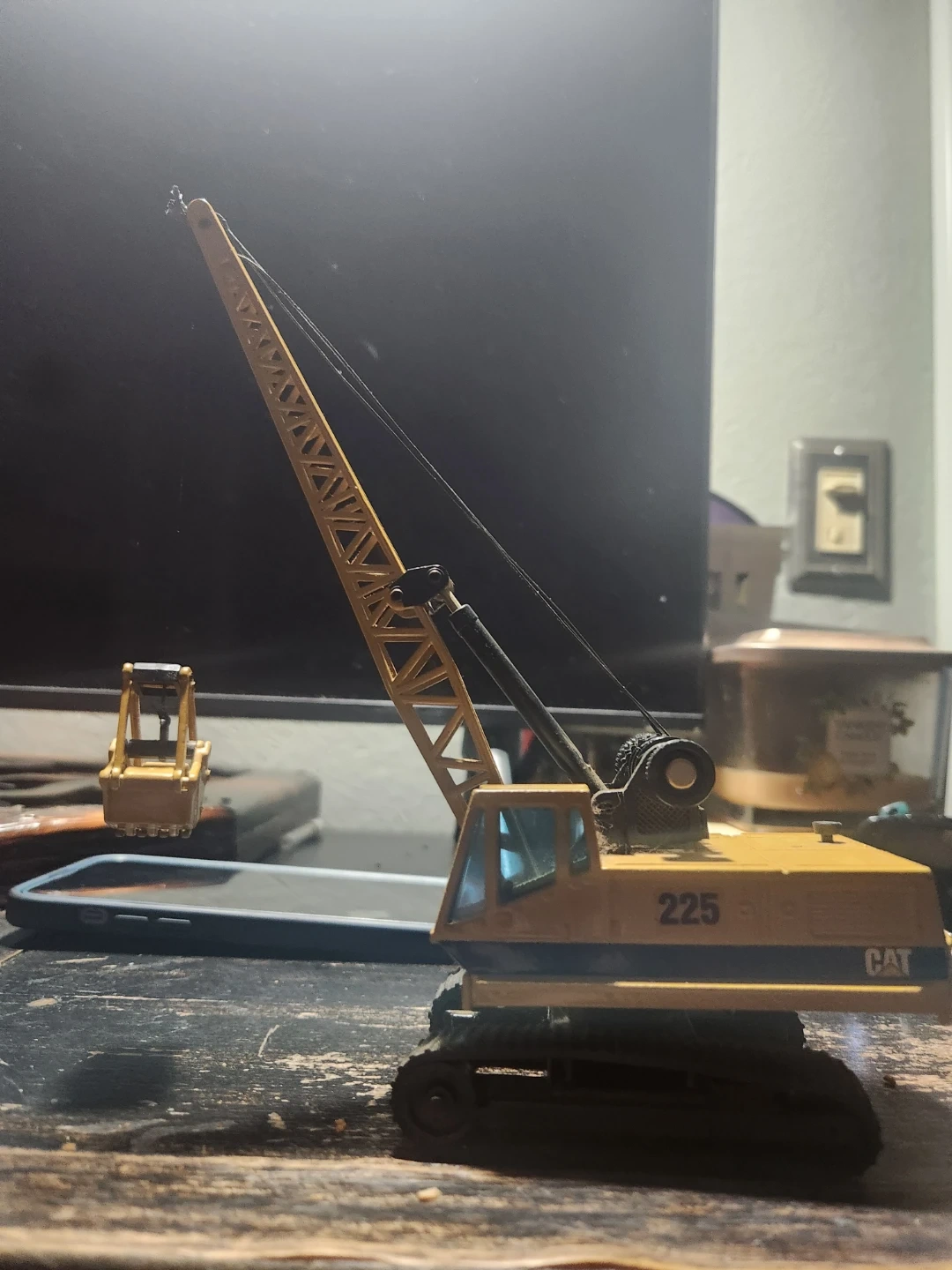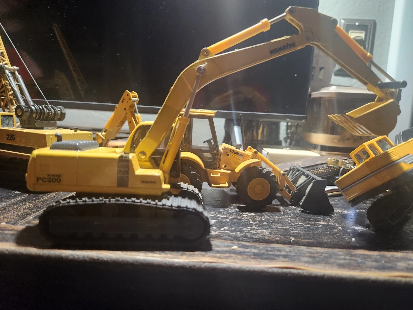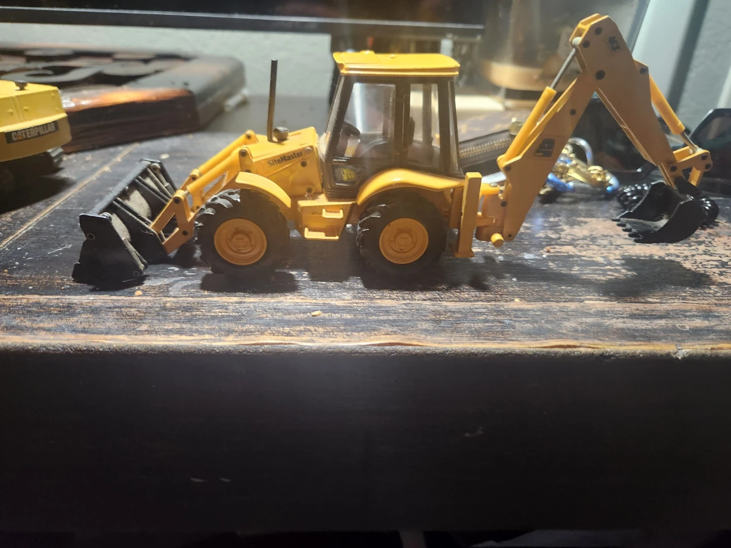 Die-cast metal toy construction vehicles. Includes a yellow Akerman EC200 excavator with tracks and a yellow JCB backhoe loader. Both feature articulated arms and buckets. Scale 1/35 and 1/50 never been played with always on display. Pick up only cash only.